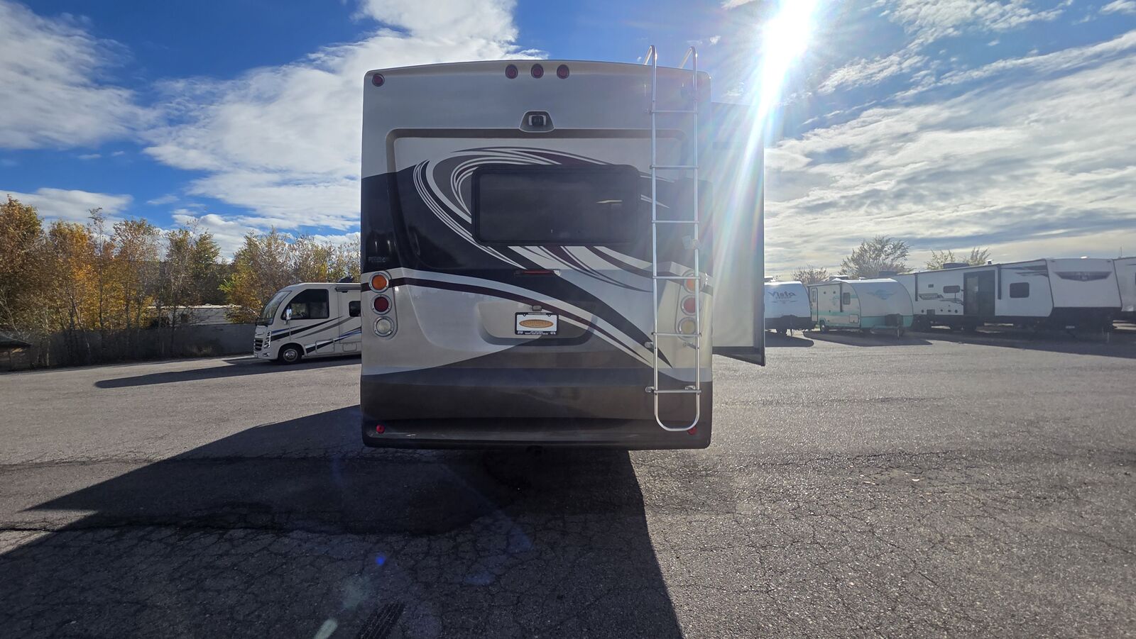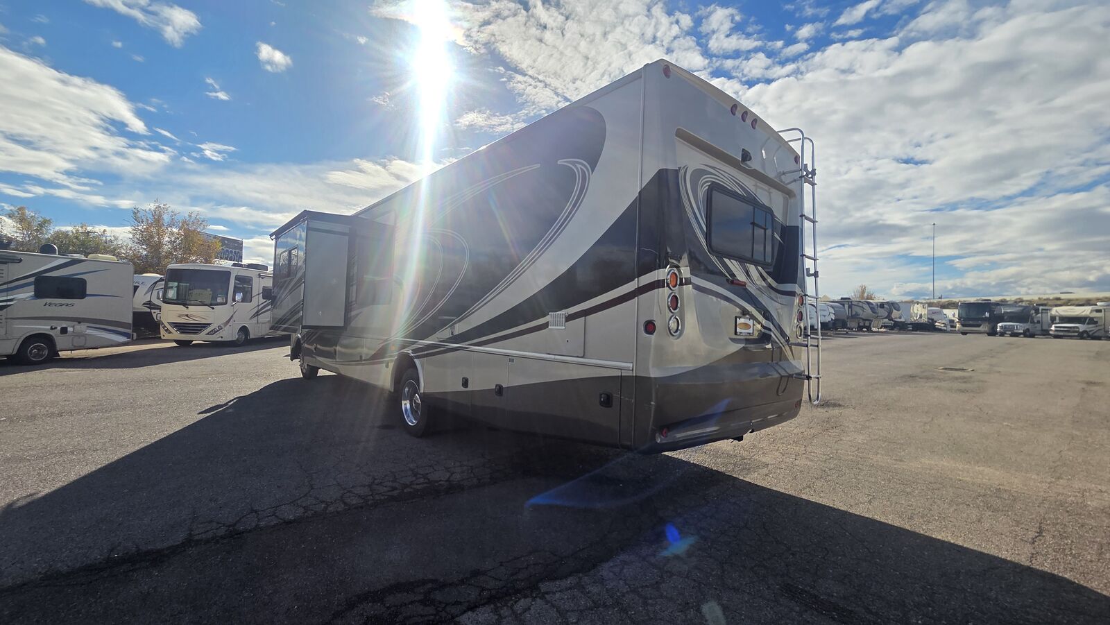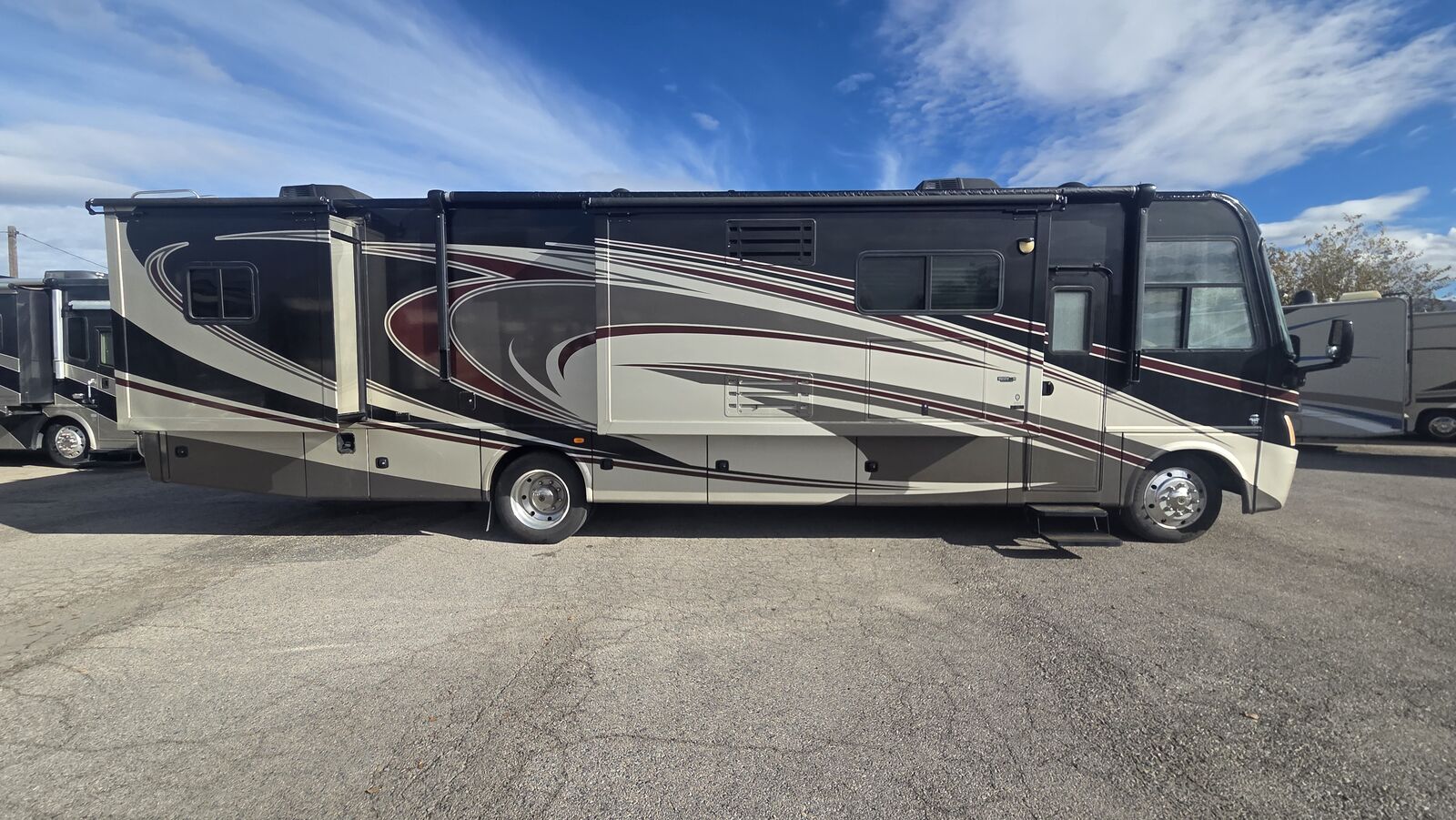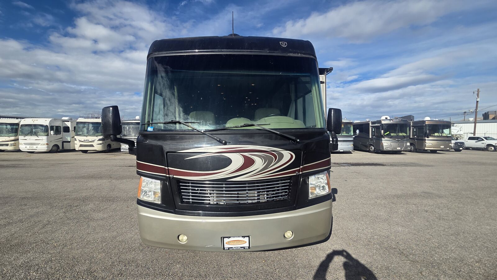 Key Specs (Factory Brochure): • Length – 37′ 10″ • GVWR – 22,000 lbs • Exterior Width – 101″ • Exterior Height – 12′ 7″ • Wheelbase – 242″ • Fresh Water – 65 gal • Gray Water – 43 gal • Black Water – 43 gal • Fuel – 80 gal • Slide-Outs – 3 • Chassis – Ford F53 • Engine – 6.8L Triton V10 • A/C – Dual Ducted • Furnace – 34,000 BTU • Generator – Onan Gas 5.5KW(hours: 1,735)