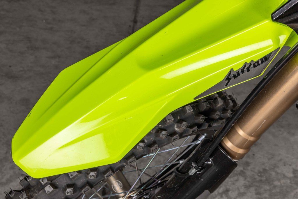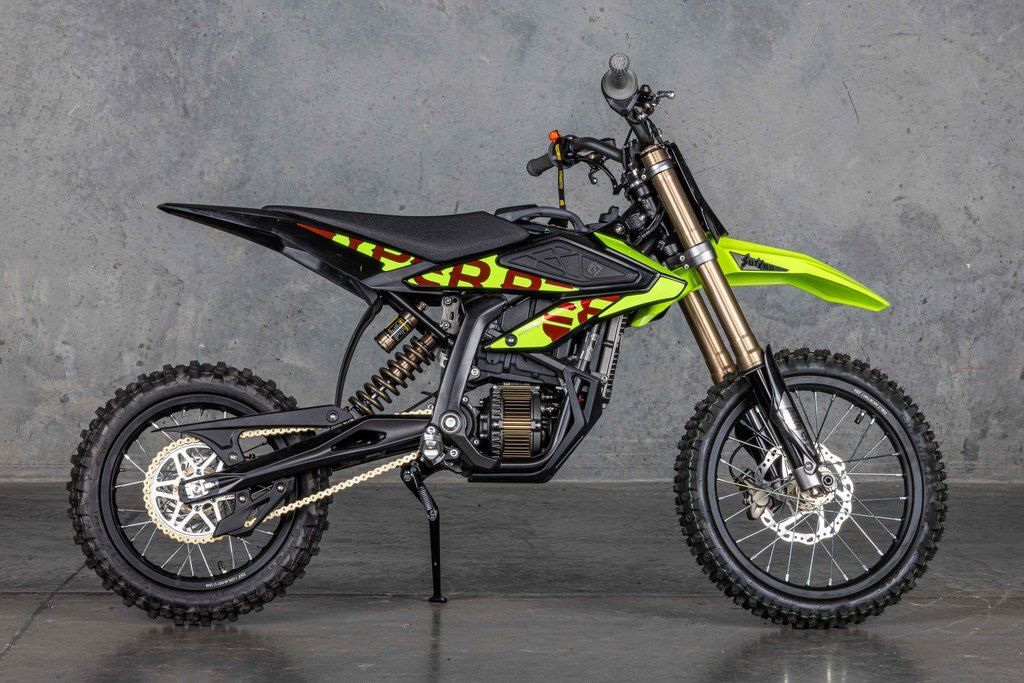 The Sur-Ron Hyper Bee is an electric dirt bike for children and smaller riders, weighing about 83 lbs with a lightweight aluminum frame, adjustable suspension, and a 5kW motor. It has a 50.4V battery, a top speed of 50 mph, and features like a magnetic emergency switch, digital dashboard, and multiple riding modes.