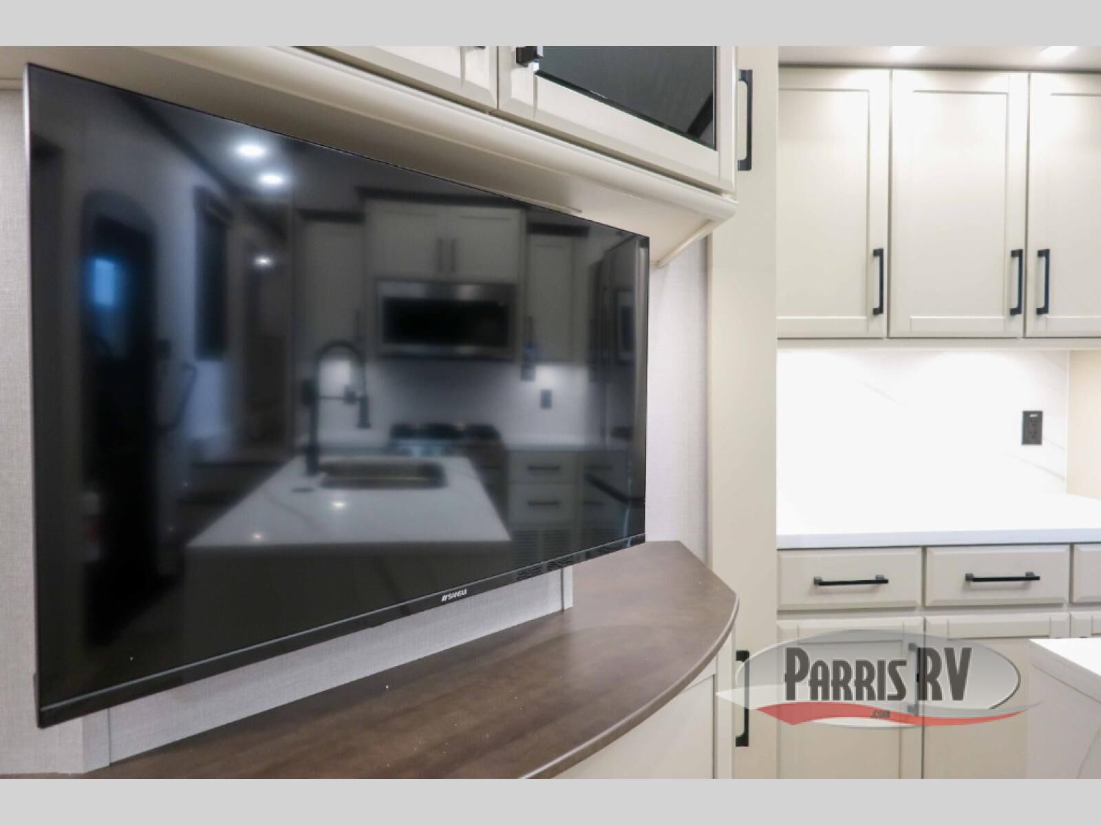 This RiverStone fifth wheel has an amazing den in the back! This area is not only an excellent lounging space with its theater sofa, hide-a-bed sofa, and entertainment center, but it is also a comfortable guest suite because it contains its own half bathroom and a drop-down queen bed. Each section of this unit has opposing slides, so you'll have plenty of living space, and the kitchen area has a pull-out dinette so that you can sit down with hot meals each night. You have a large pantry for snacks and an 18-cubic foot French door refrigerator with ice maker for cold beverages. The ceiling fan allows you to cool off the interior without overworking the AC, and the cordless vacuum will help you clean up messes.
