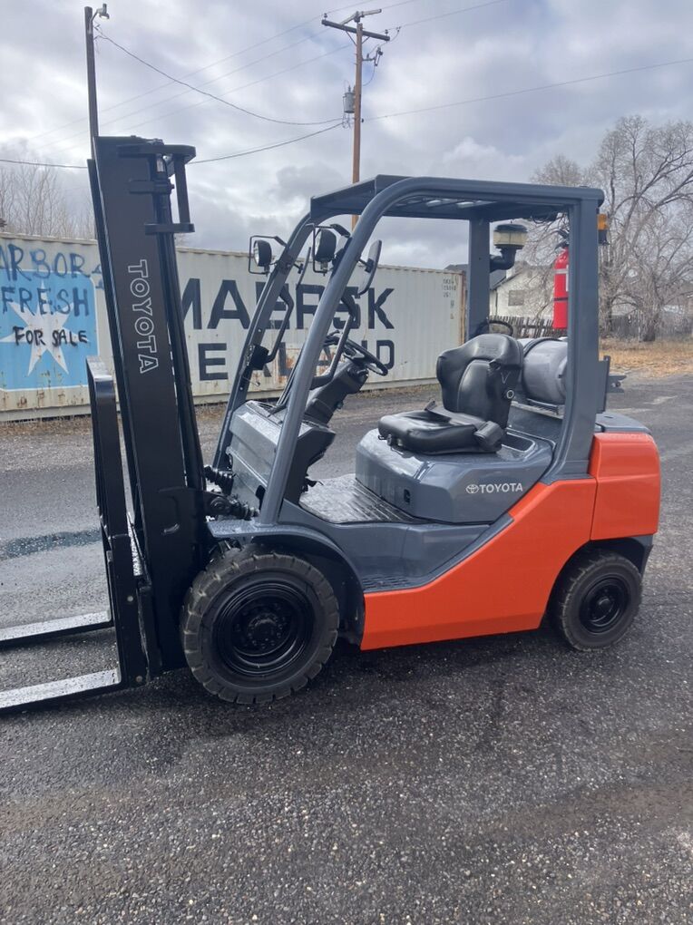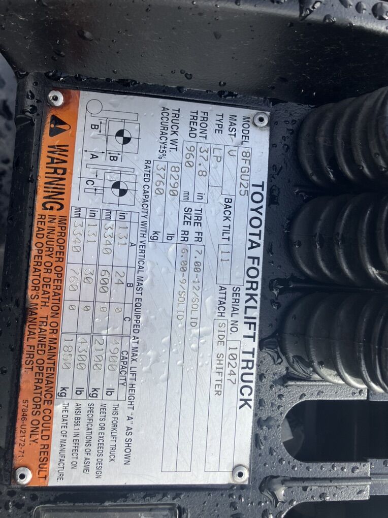 Toyota 8FGU25 Capacity: 5,000 lbs Hours: 5,345 Mast: 2 stage 84.5” lowered/ 131” max lift height Side shifter / 42” forks Fuel: LPG propane Tires: Solid filled pneumatic