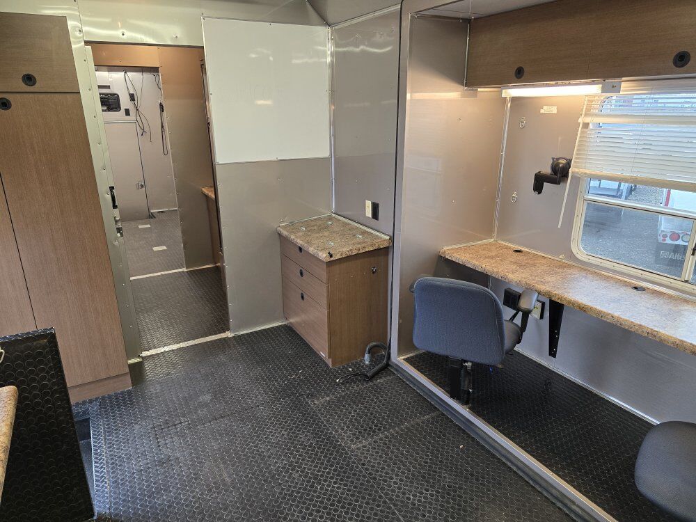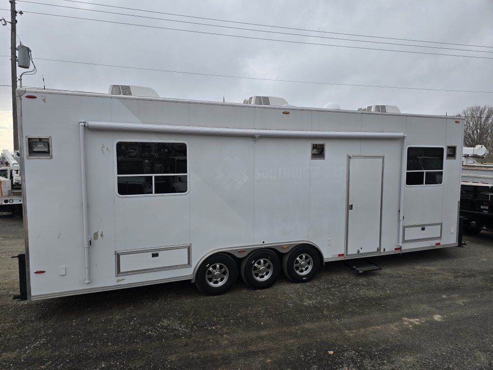 2012 Brown Motor Sports 34 foot mobile office trailer, 12kw diesel Onan generator with 827 hours, three 6,000 pound electric brake axles, 18,000GVW, three rooftop air conditioners, refrigerator, microwave, two separate rooms with slide-outs, two entrances with a shared kitchenette and bathroom, wired for tvs, internet, phone, satellite and cameras, outdoor lighting all around, underbody storage, cabinets and desks throughout, furnace, good tires, former municipal trailer 208-734-3434