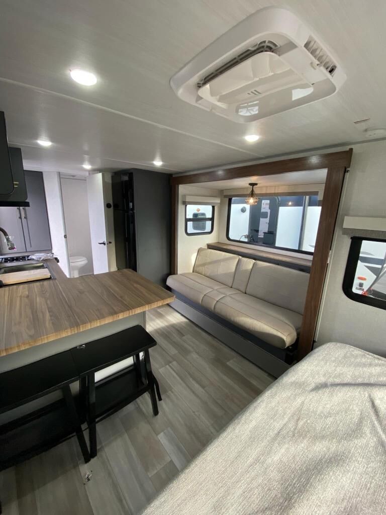 This Ibex travel trailer is incredibly versatile! With two sofas, there's plenty of room to relax inside, or set up outdoors under the 16' awning. There's a 60" x 80" Murphy bed where you'll be able to sleep comfortably, and you can dine in style at the L-shaped countertop with bar stool seats and chat with the cook in the kitchen. At the rear you'll find a full bath with a radius shower, a toilet, and a sink with a medicine cabinet above it. When the optional Beast Mode Package is chosen, you'll enjoy an independent suspension, 400 watts of solar power, a 30A charge controller, and a 2000W inverter.