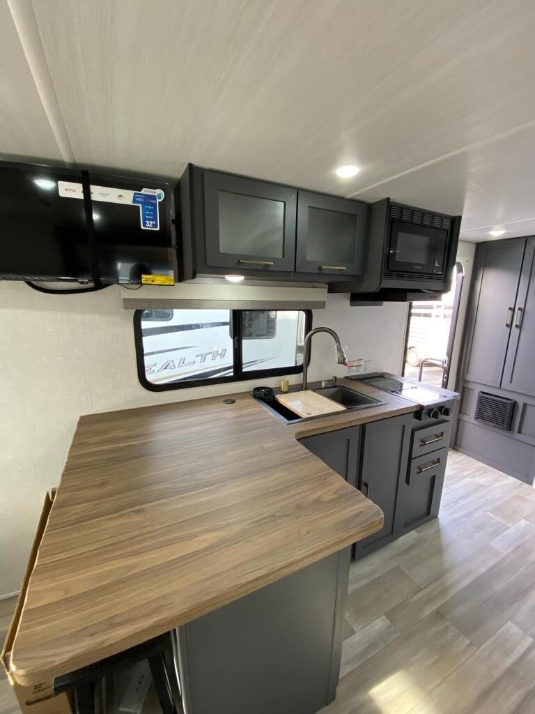 With any IBEX travel trailer or toy hauler by Forest River, you will find a fully enclosed underbelly with radiant foil for added insulation and a Cold Weather Package with 12V heated tank pads to help extend your camping season. There are also laminated walls with aluminum construction and Azdel composite substrate and a TPMS system with a wireless display so you can easily keep an eye on your tire pressure levels. The mandatory XLT Package also comes with a rugged tire and wheel package, solid surface entry steps, and a solar package with a 200W solar panel, 20A charge controller, and 2000W inverter prep.