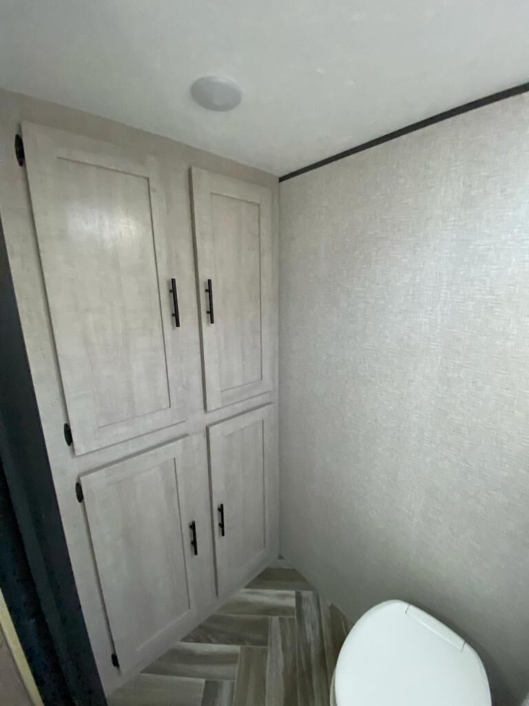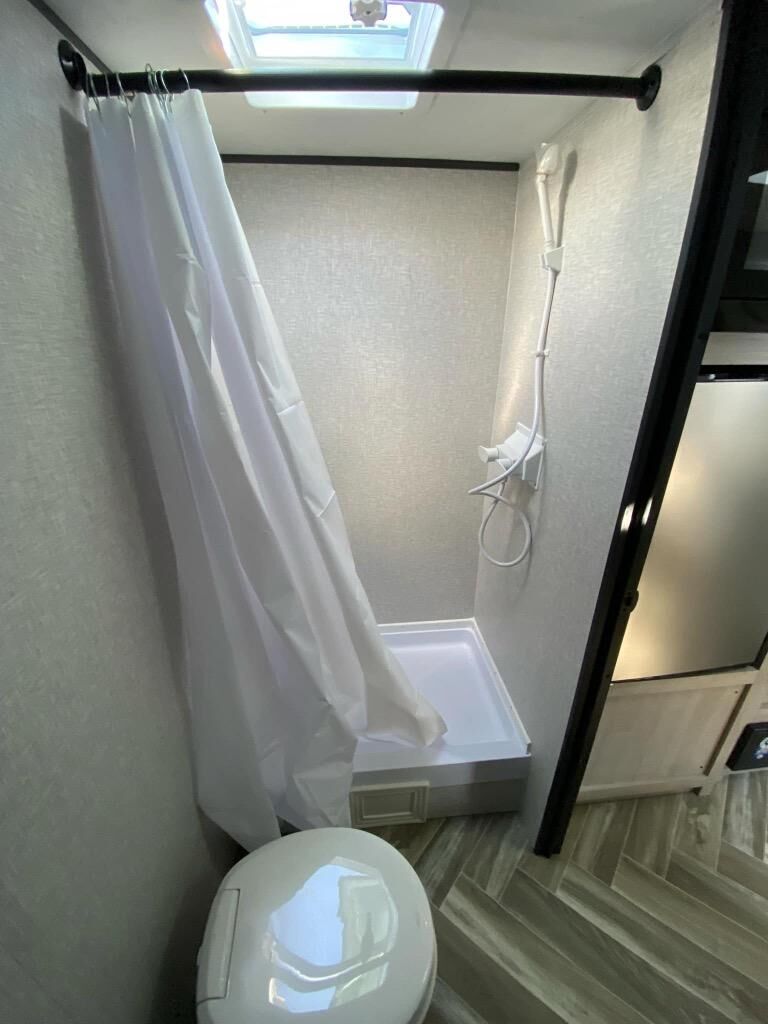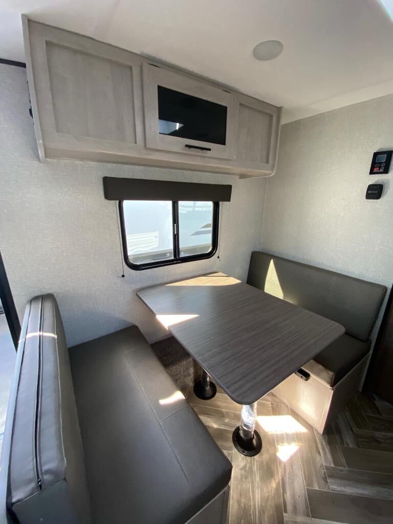 You and your spouse will love camping in this Zinger Lite travel trailer! The full rear bathroom has a 36" shower for you to rinse off the day and a linen closet to store your towels. You can prepare home-cooked meals with the two burner cooktop and enjoy eating them at the booth dinette. You will also start each day feeling ready to go after sleeping on the front RV queen bed with an overhead shelf for your belongings.