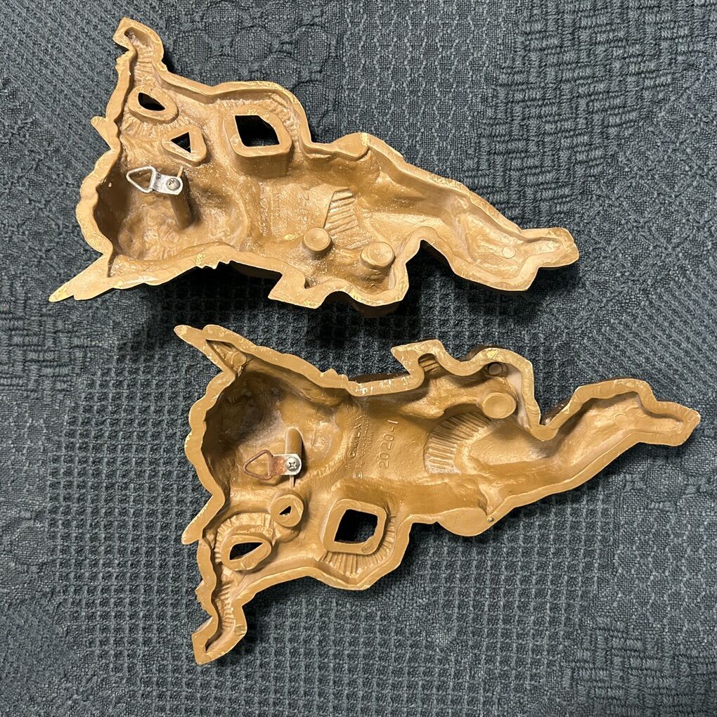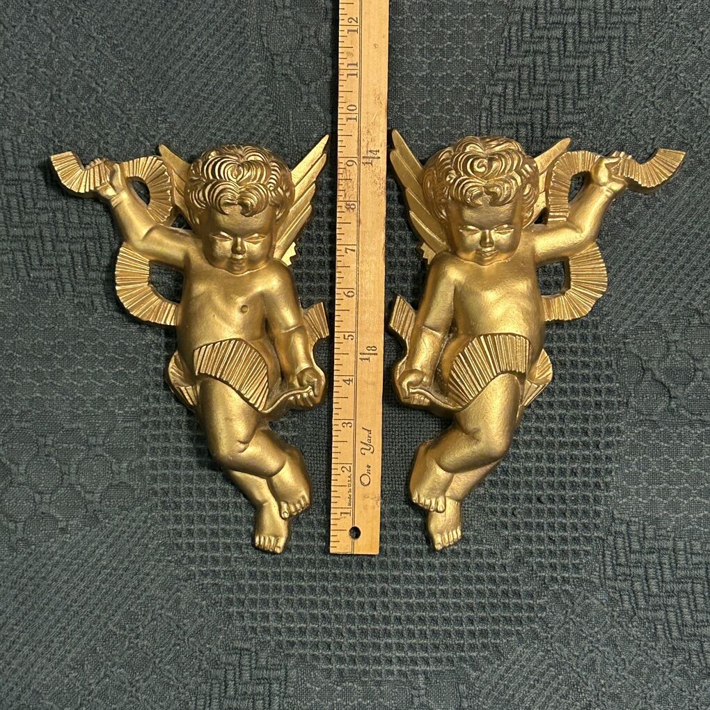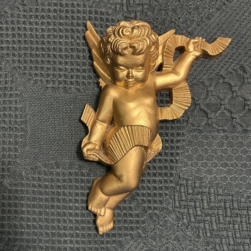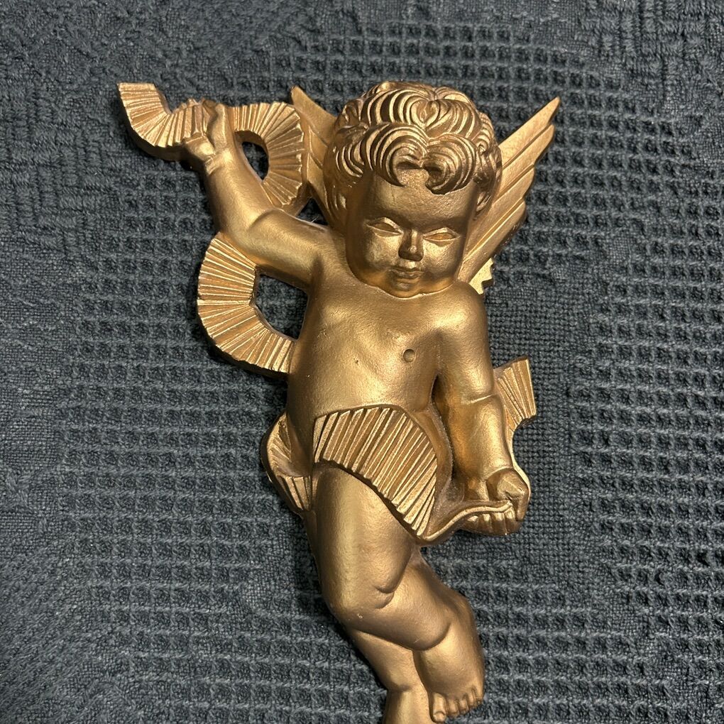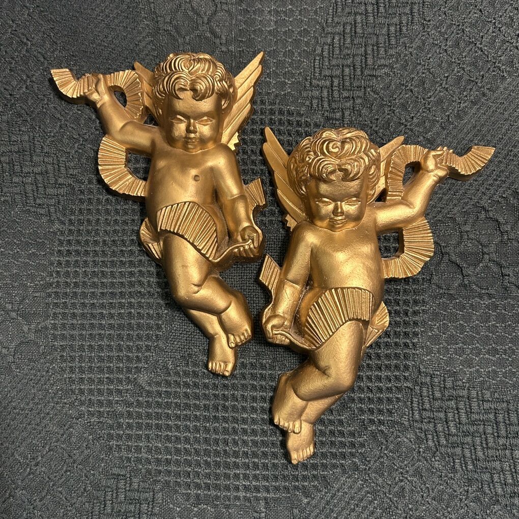 Vintage Matching Set of Two Burwood Gold Cherubs Wall Hangings Decor Retro # 2020-2. Very lightweight and easy to hang. In Pristine condition: No chips, scratches, cracks, or defects except for a “birthmark” manufacturing flaw on the torso of one cherub caused by a bubble of air when little angel was made. Smoke Free. 9.5” Tall X 6.5” wide. Delivery available to a convenient location when in your area for $5.
