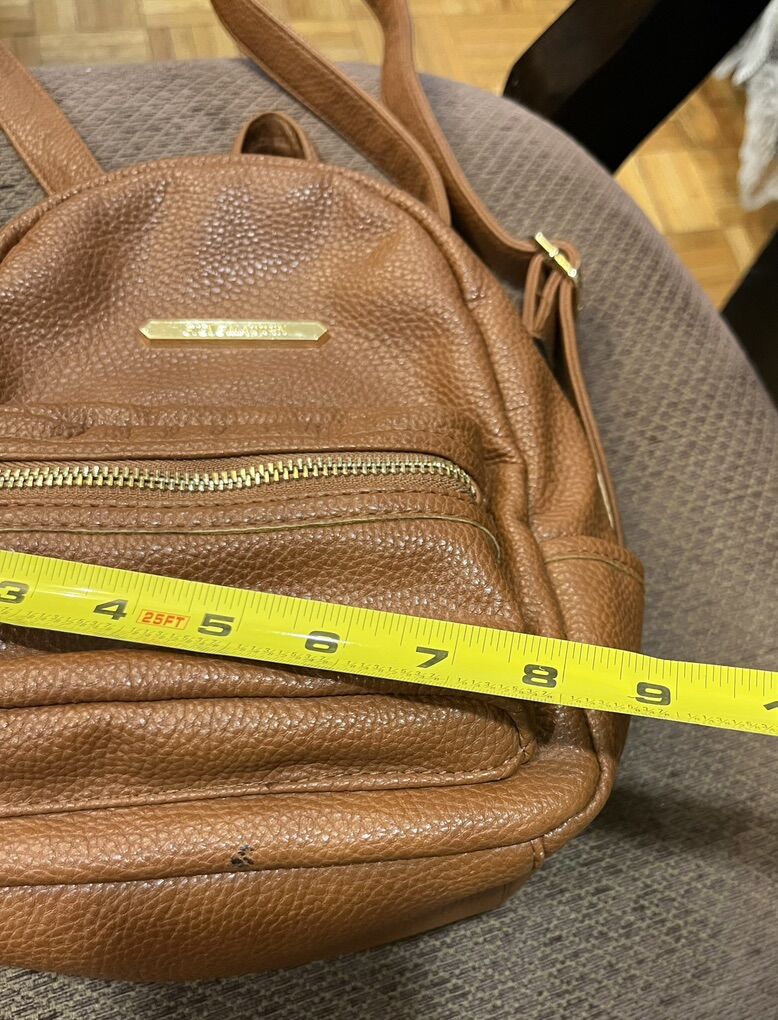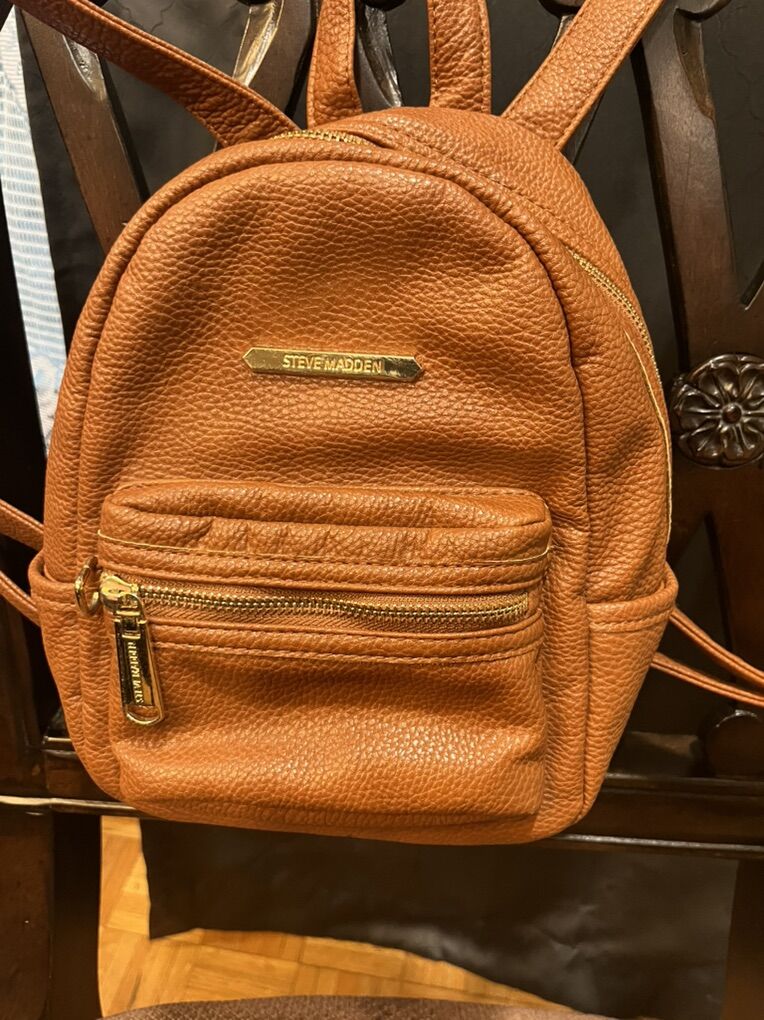 VenmoIn good shape Steve Madden ran mini backpack which features pebble faux leather finish in gold tone hardware. A zip top closure front zip pocket and top handle and adjustable shoulder strap.