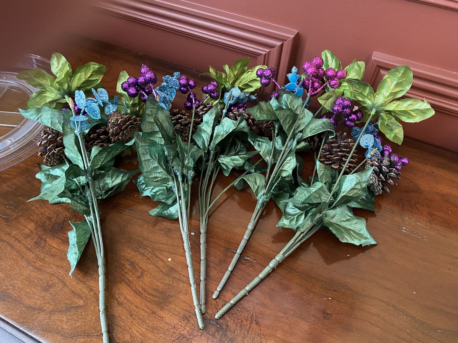 NEW - Five Festive Poinsettia-Pincones-Glitter Berries and Eucalyptus Large Stems/Picks - C PIX. Sold as a set.