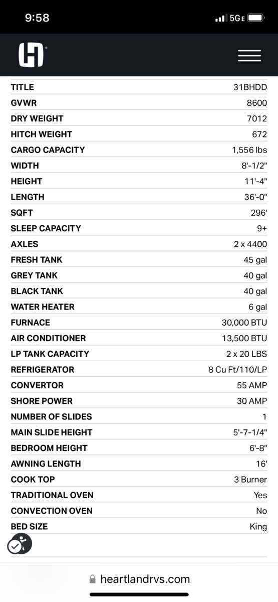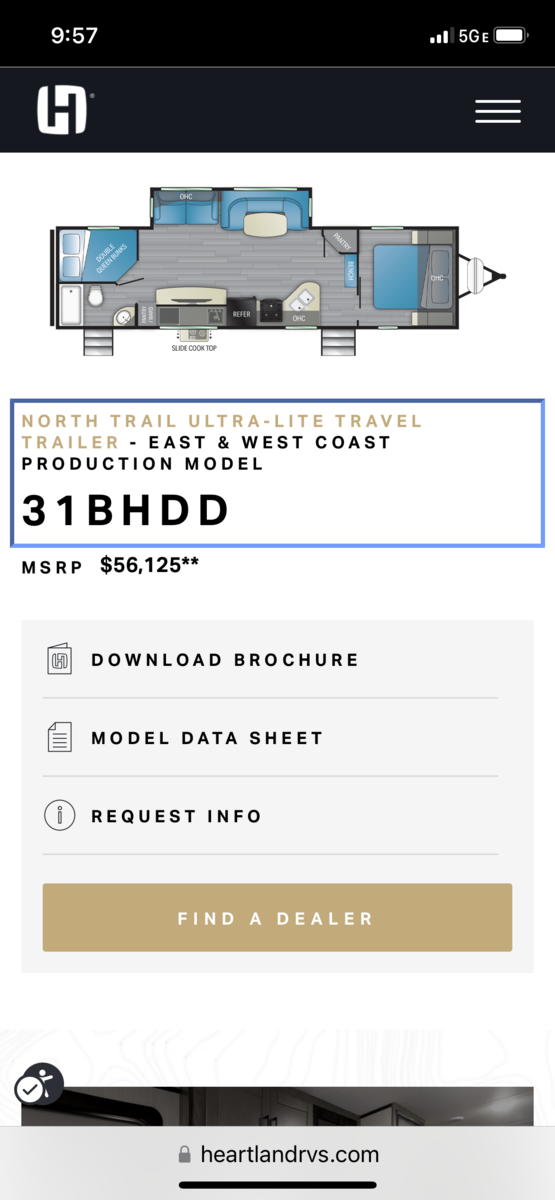 Single owner, bought new, clean and fully loaded 2019 31bhdd heartland northtrail "caliber edition" bumper pull travel trailer: 31ft living space and 35.5ft total length including tongue. Features include: roof top solar panel, batteries, power hitch and levelers, outside shower, flip-down tailgate for extra hauling, spare tire, outside fridge, sink, cooktop, power awning with color changing LED light strip, int and ext speakers with Bluetooth capable stereo, TV antennae and long range wifi extender, queen bedroom, double over double bunks, sleeper sofa, table converter to sleeper, hall tree with bench seat, full kitchen with pantry, refrigerator runs on propane or electricity, large flat screen TV with HDMI for video game or media player, heat and AC, central vac. All manuals and controls are included. Everything is in working order. Extras included: power cords and amperage adapters, coax cable, drinking water grade hoses, water filter, 4 way sway control hitch, waste line hoses, hose for black water tank cleaning connection, interior rugs (2), collapsable trash container, leveling pads, dual propane tanks. Tires are in great condition.