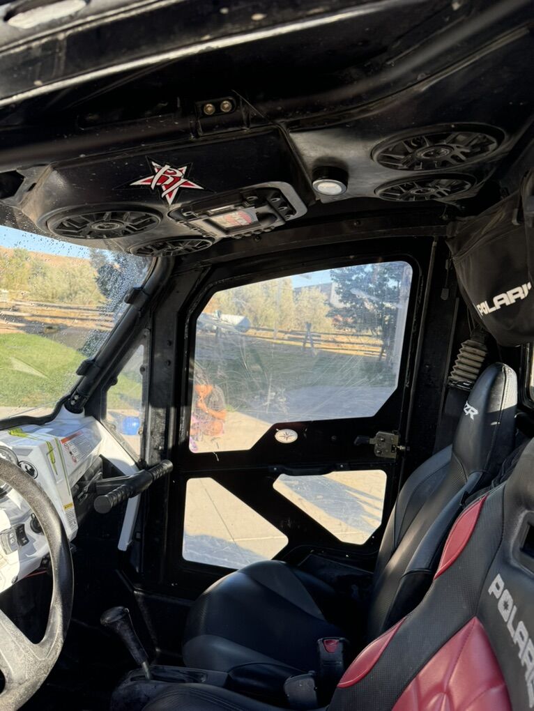 Full enclosed cab with removable doors No heater Skid plates/ rocker arms/ skid plates on front a-arms Winch Stereo/ older iPods with dock to the stereo Comes with spare belt 2 spare rims Extra seat