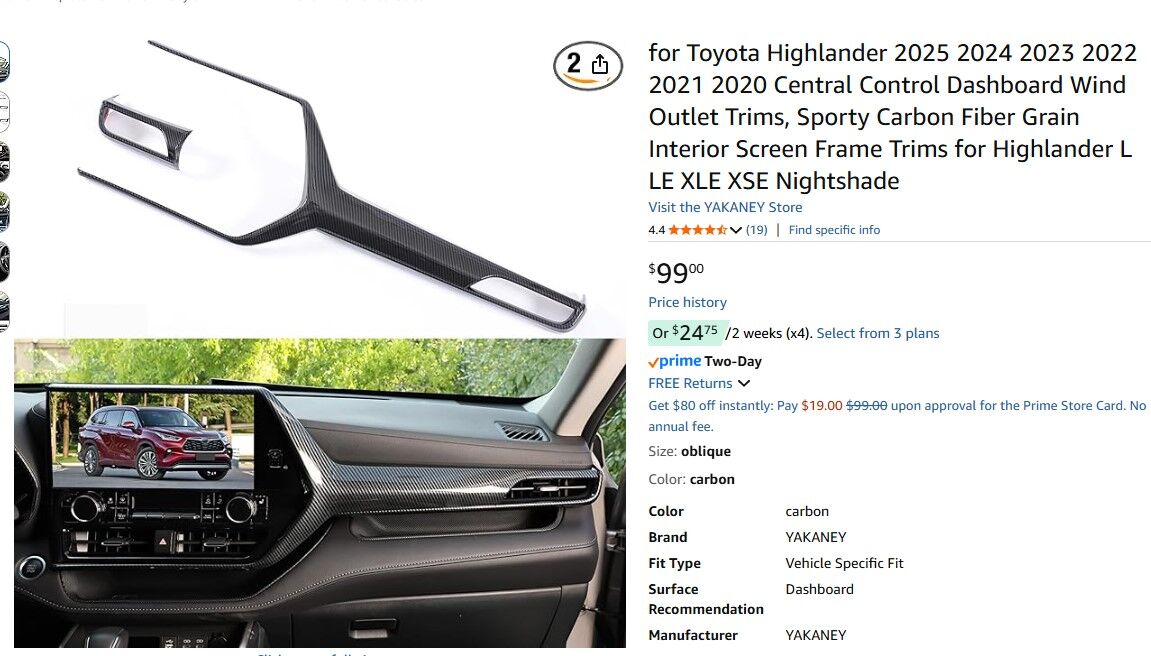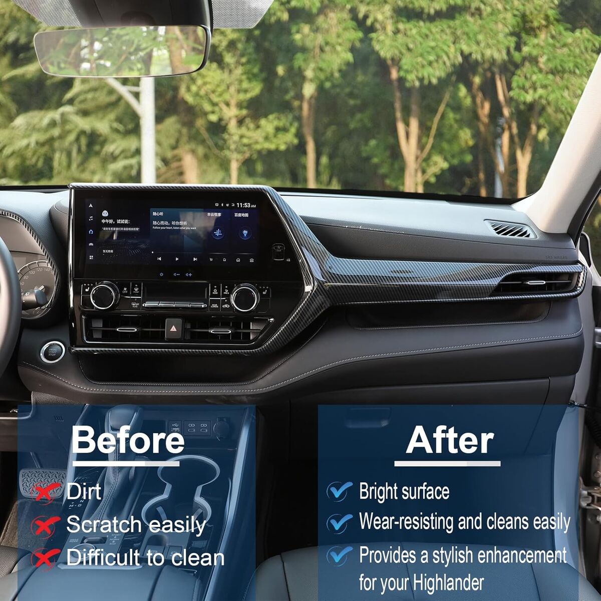 Design: Precisely engineered for Toyota Highalnder central control dashboard with the most popular carbon fiber grain surface, rearlly add a little sporty cool style, also covers the original silver trims, enhanced the sense of power in the car interior, protect the dashboard from scrathing