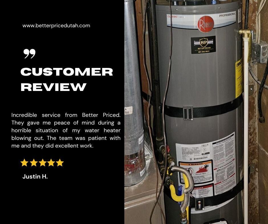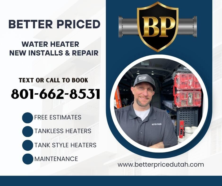 My Name is Andrew and I've been a plumber for over 25 years. I grew up in the Salt Lake Valley and I absolutely can say that I love this area and I'm here to stay. Experienced in residential plumbing service repairs and replacements. I worked for the bigger companies and I noticed that their pricing was getting out of control. I no longer felt comfortable working for these types of places so I started Better Priced Water Heaters and Water Softeners with a goal to give a better service with a better price! We will never be the cheapest in town nor will we be the most expensive, but you can always count on a drug free, insured and licensed professional to give you upfront fair prices and options for your project. No work will ever begin without your approval first. Our team will always strive to give you a 5 star experience and we won't leave until you're completely happy with our service. CHOOSE BETTER AND CALL OR TEXT TODAY!