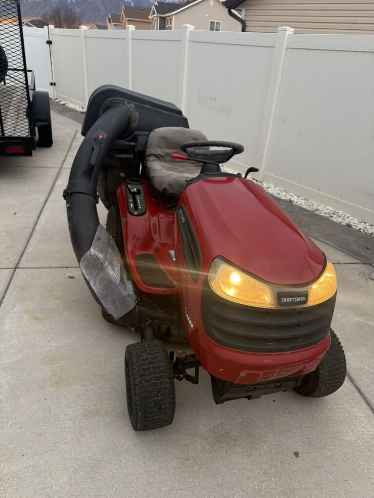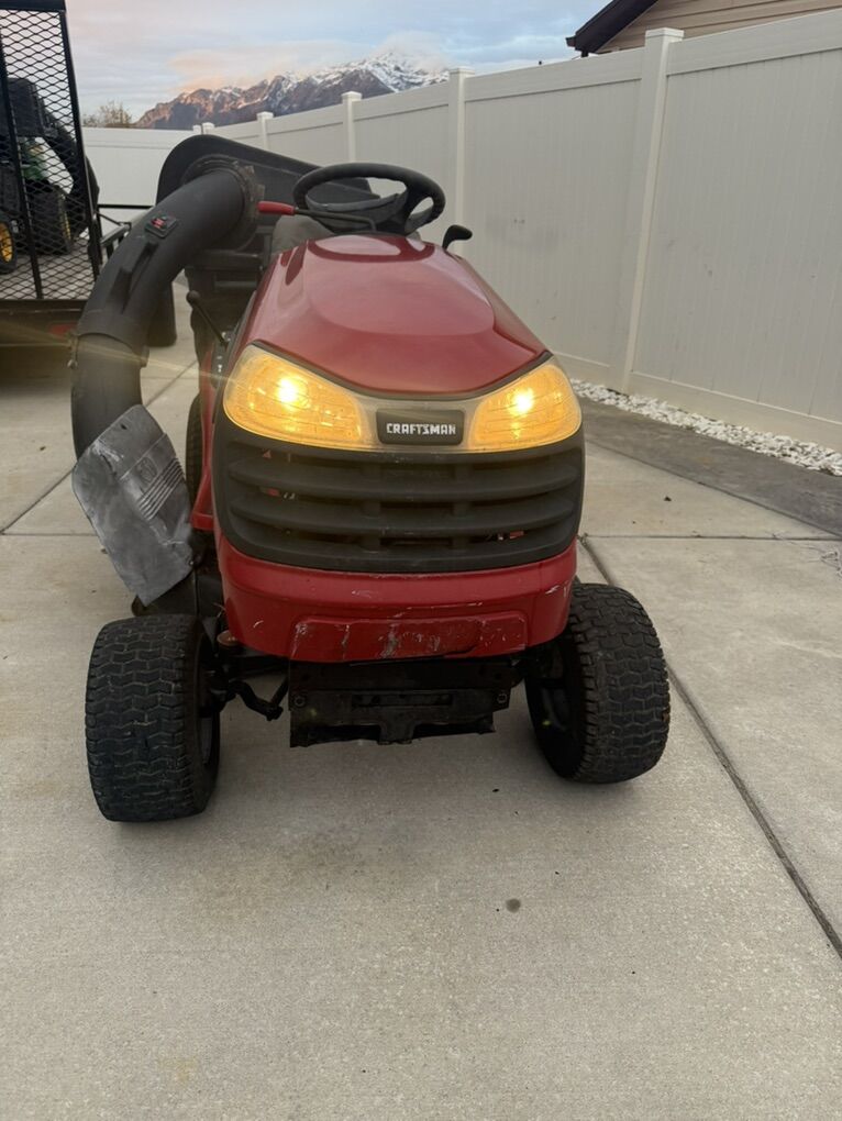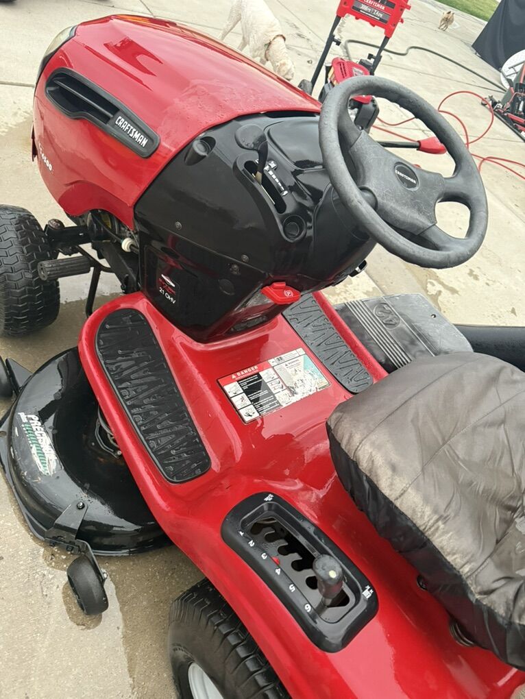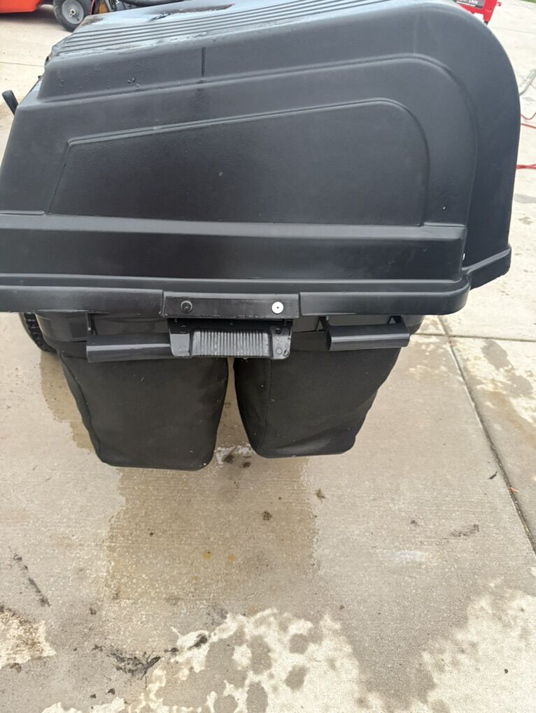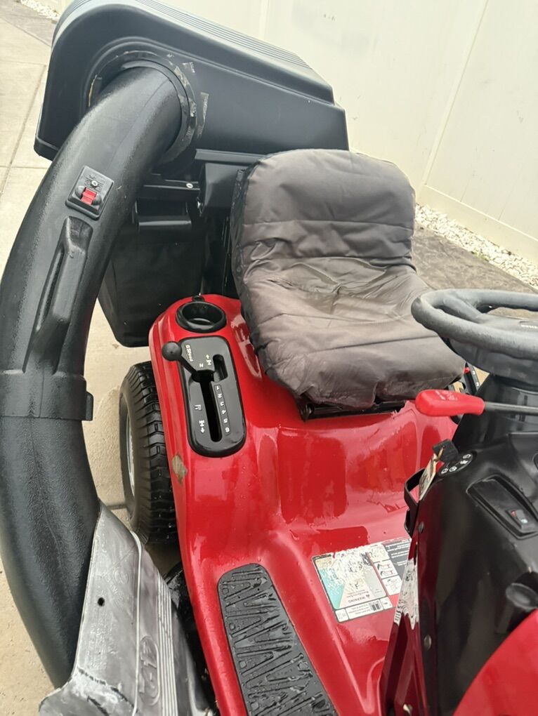 Runs great. Just got serviced. It does not have an hour meter. This machine has a 21 hp engine and a 42 inch cutting deck. Blades have been sharpened and balanced. Also comes with a double bagger to help cleanup all the leaves that fall season blesses us with or to clean and pickup the grass clippings from mowing your lawn and having your yard looking crisp and clean. The pull behind fertilizer spreader also comes with the machine.