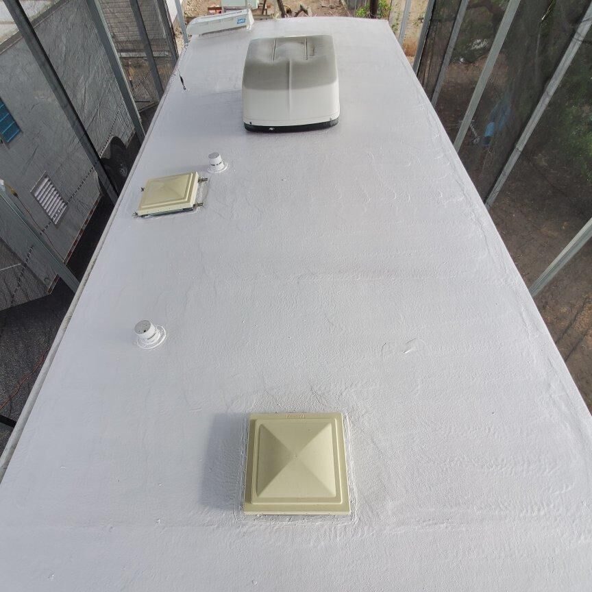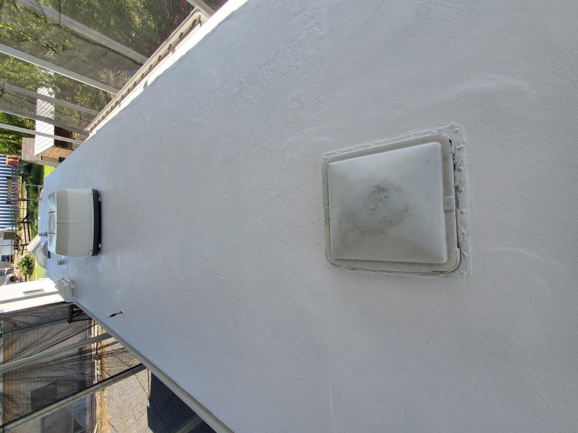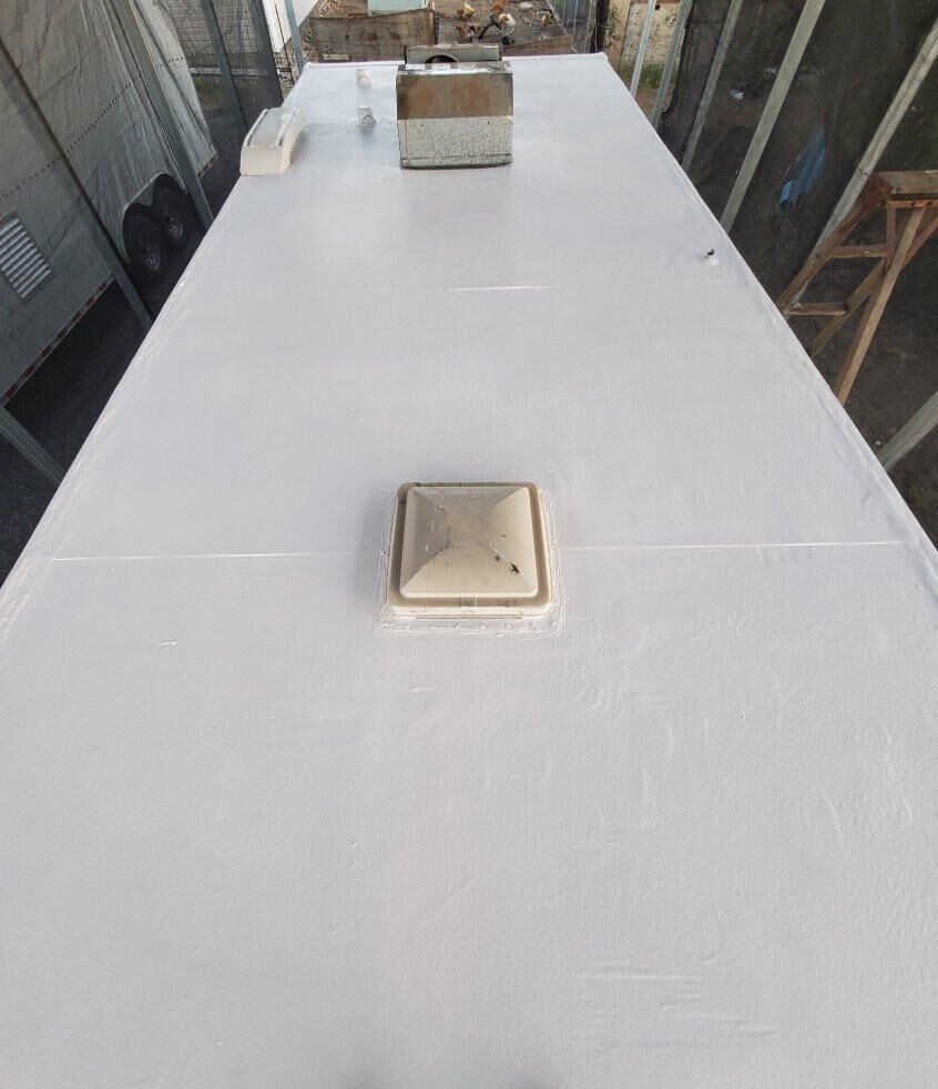 We specialize in RV Roof replacement using polyurea. Our process...we remove your existing vents, AC unit(s), and roof membrane, seal major cracks and repair any damaged wood, spray on the polyurea right to the wood structure, reinstall the vents, AC Unit(s), etc and add a white top coat. This comes with a 25-year roof warranty and much needed peace of mind!