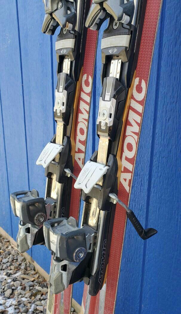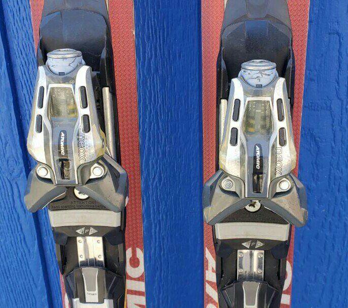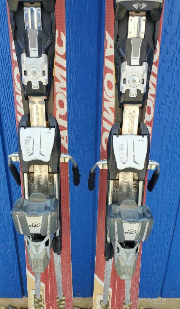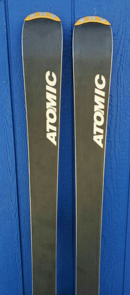 Awesome Men's 165 cm Atomic M2 Tron all mountain downhill snow skis. Skis have Atomic Neox bindings. Tip/Waist/Tail Dimensions: 119/84/109mm. Turning radius 18m. Text please!