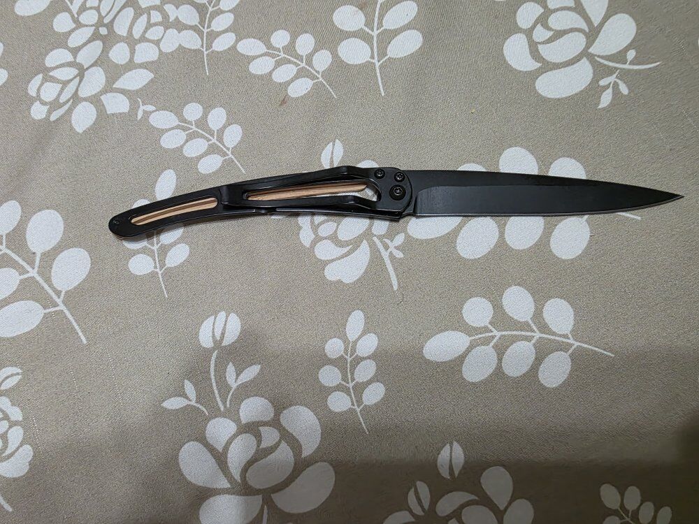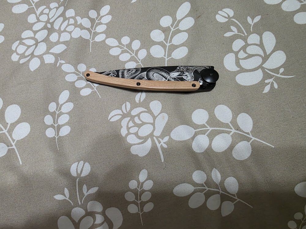 VenmoDeejo 37 Juniper Wood/Snake Tattoo. Overall length 7.87" blade is 3.74". Very unique knife, has not been used. Cash only, text only and FIRM on price. Thanks!