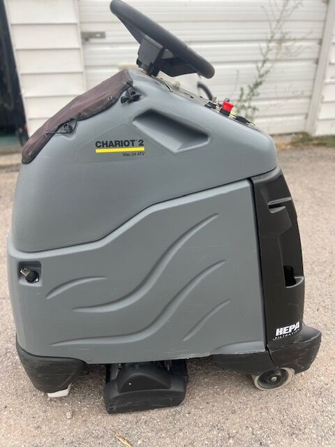 Design and size that provides remarkable maneuverability, and best-in-industry 360º visibility. Chariot stand-on productivity. 24 inch cleaning path is the right-size for multiple applications. Increase your productivity in applications where a sweeper, wide area vacuum, back pack vacuum or dust mop are currently utilized Easy to use. Simple, intuitive control panel. Battery operated, reducing trip and falls. Easy no-tool removal of the universal counter-rotating brushes. Convenient on-board tool storage compartment Versatile. Vacuums carpet, tile, wood, concrete, stone, rubber, VCT HEPA filtration standard. Captures large debris in a vacuum tray, preventing clogs. Standard 10 inch hose and hand tools for off-aisle cleaning. 68 dBA, quieter than a traditional wide-area vacuum with the same pick-up and performance.