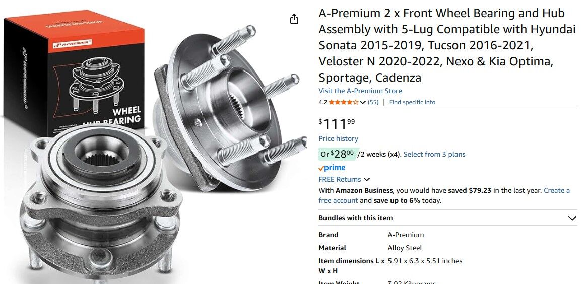2 x Front Wheel Bearing and Hub Assembly with 5-Lug Compatible with Hyundai Sonata 2015-2019, Tucson 2016-2021, Veloster N 2020-2022, Nexo & Kia Optima, Sportage, Cadenza