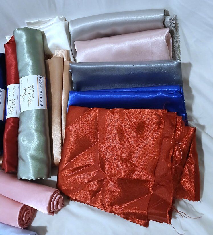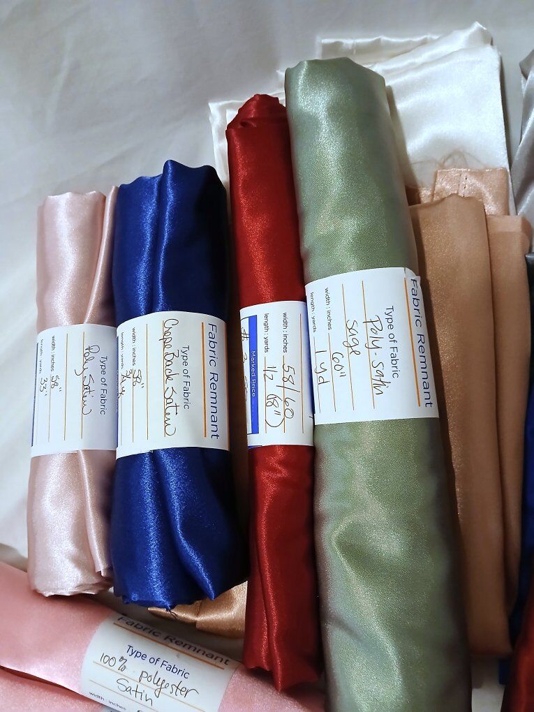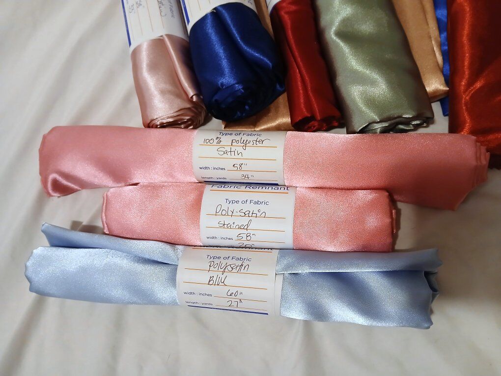 VenmoCleaning out my stash and this is not my favorite fabric to work with. 14 remnants of poly satin fabric. Measurements and colors pictured. $1 each for the pink rolls (with the paper on) because of minor stains. $2 each for all the rest. $18 for all of it. Cash or venmo. Check out my other listings!