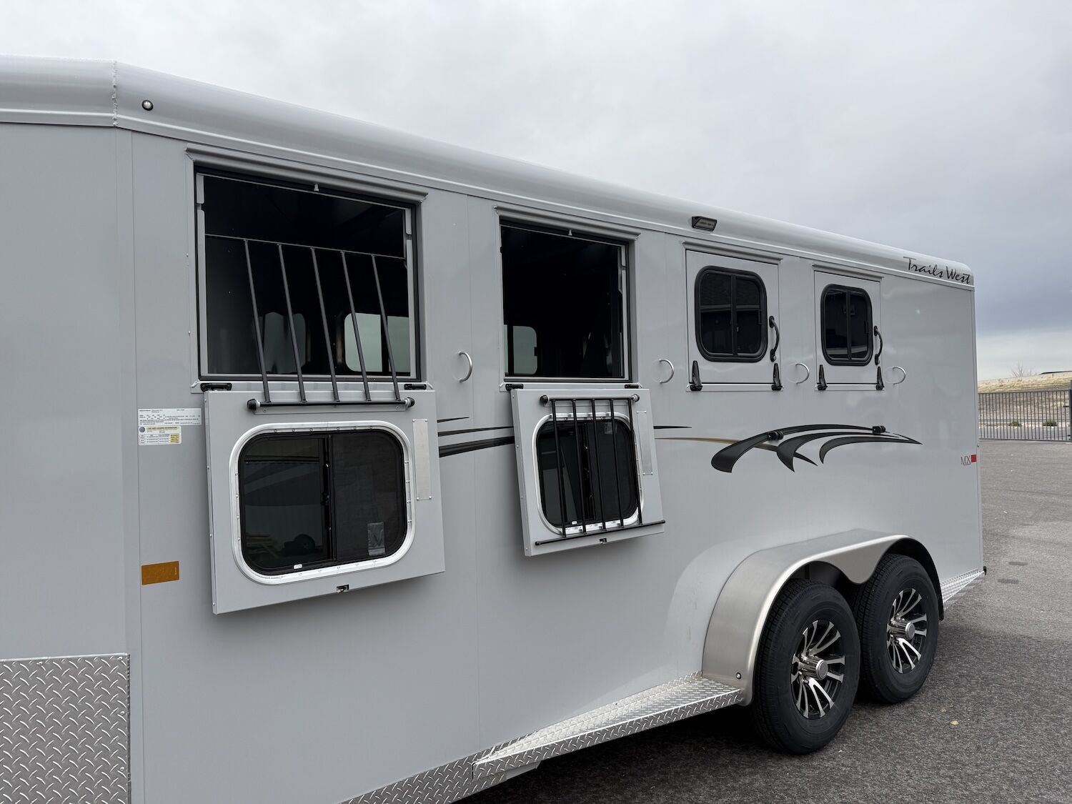 The newly redesigned Adventure MX is here! New for 2026 is the rotary latch for the tack door and the redesigned nose! The Adventure MX trailer from Trails West is the best priced steel framed aluminum skinned trailer in the industry. It has the perfect combination of style, user friendly features, and value. This trailer has newly designed aerodynamic front, head side drop down feed windows, tail side sliding windows and rubber wall mats all the way around the horse compartment making it the best equipped trailer in its class.