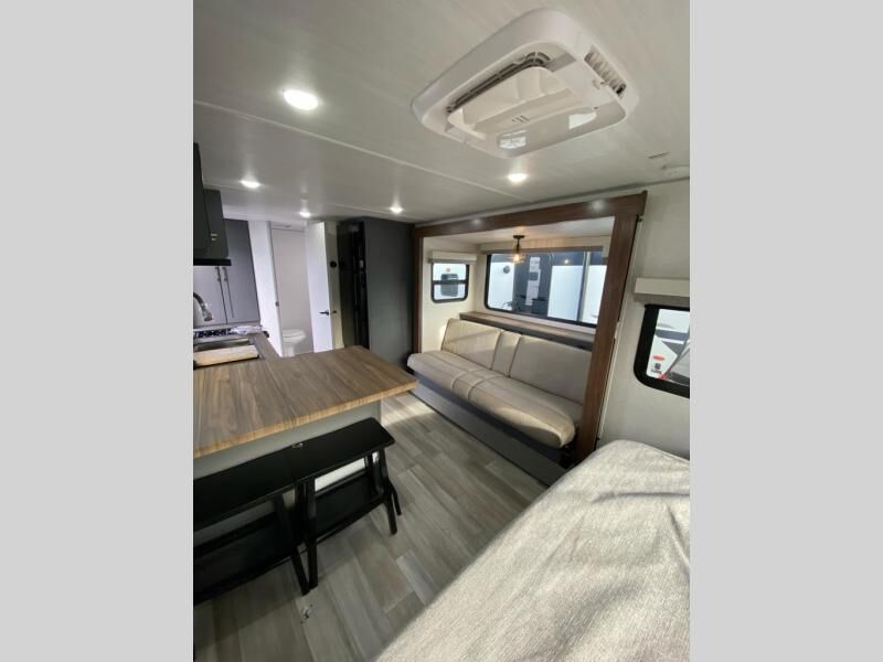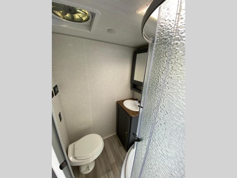 This Ibex travel trailer is incredibly versatile! With two sofas, there's plenty of room to relax inside, or set up outdoors under the 16' awning. There's a 60" x 80" Murphy bed where you'll be able to sleep comfortably, and you can dine in style at the L-shaped countertop with bar stool seats and chat with the cook in the kitchen. At the rear you'll find a full bath with a radius shower, a toilet, and a sink with a medicine cabinet above it. When the optional Beast Mode Package is chosen, you'll enjoy an independent suspension, 400 watts of solar power, a 30A charge controller, and a 2000W inverter.