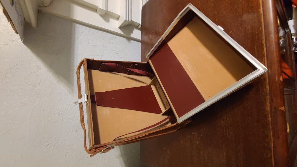 Zelle$10 Cash or Zelle, NO Venmo sorry. Pickup downtown near the capitol, first come first served, cross posted. Measures 10" wide, 11" tall, 3 1/2" thick. I let a friend use this to store important papers. He over filled it to where it couldn't close, and this subsequently caused the visible crease on the front from where the "door" was flopped open for a prolonged time. Still a cool case, in generally good condition though.