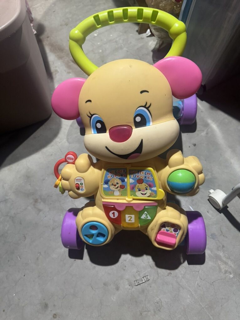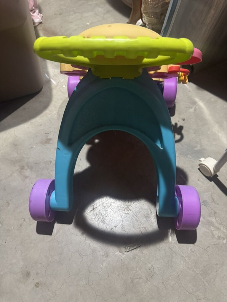CashAppThis musical baby walker offers two ways to play as a child grows: sitting and playing, or standing and walking. It includes three Smart Stages learning levels with over 75 songs, sounds, and phrases that introduce the alphabet, shapes, colors, numbers, and Spanish words. The toy features seven hands-on activities, including light-up piano keys and nose, a roller, a spinner, and a flip page. It has an easy-grasp handle and a sturdy, 4-wheel base to help steady a baby's first steps. The product helps strengthen fine and gross motor skills for infants and toddlers ages 6 months to 3 years old.