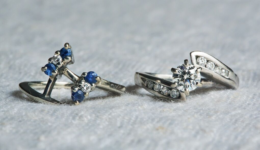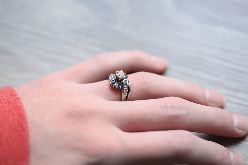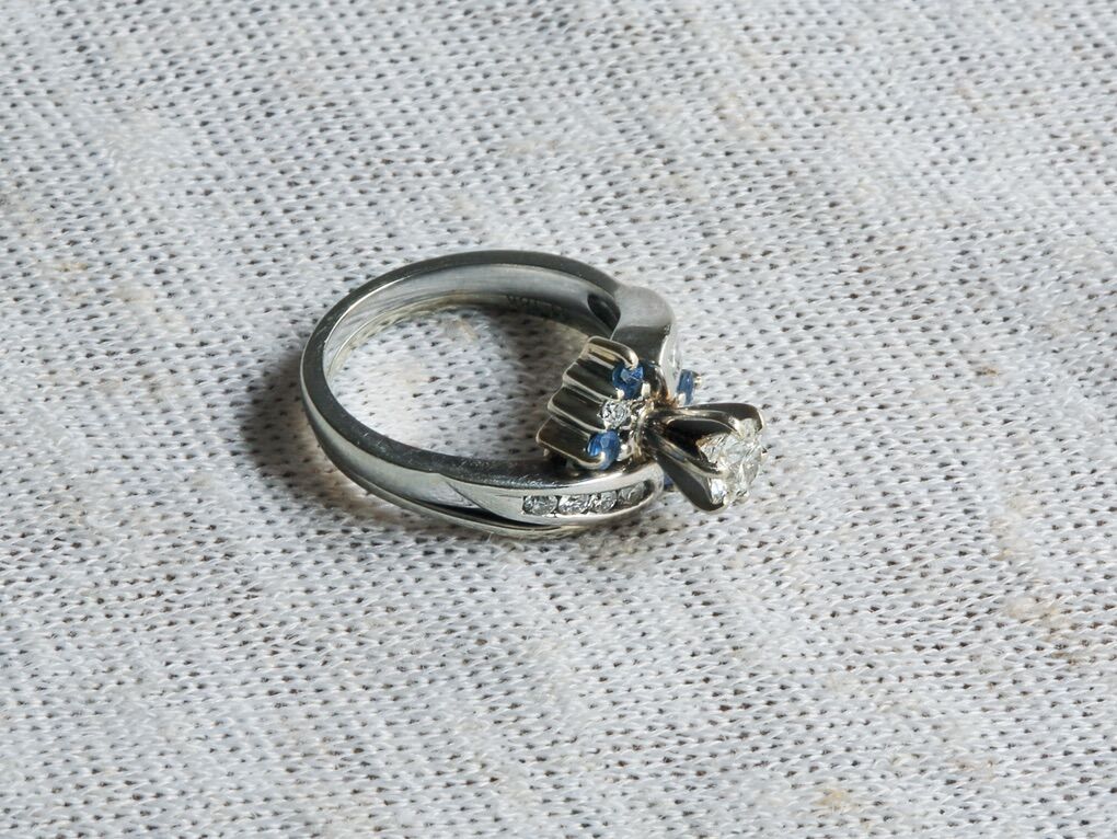 ZelleWhite gold ring set, 18k, with diamonds and yogo sapphires. Size 4 3/4