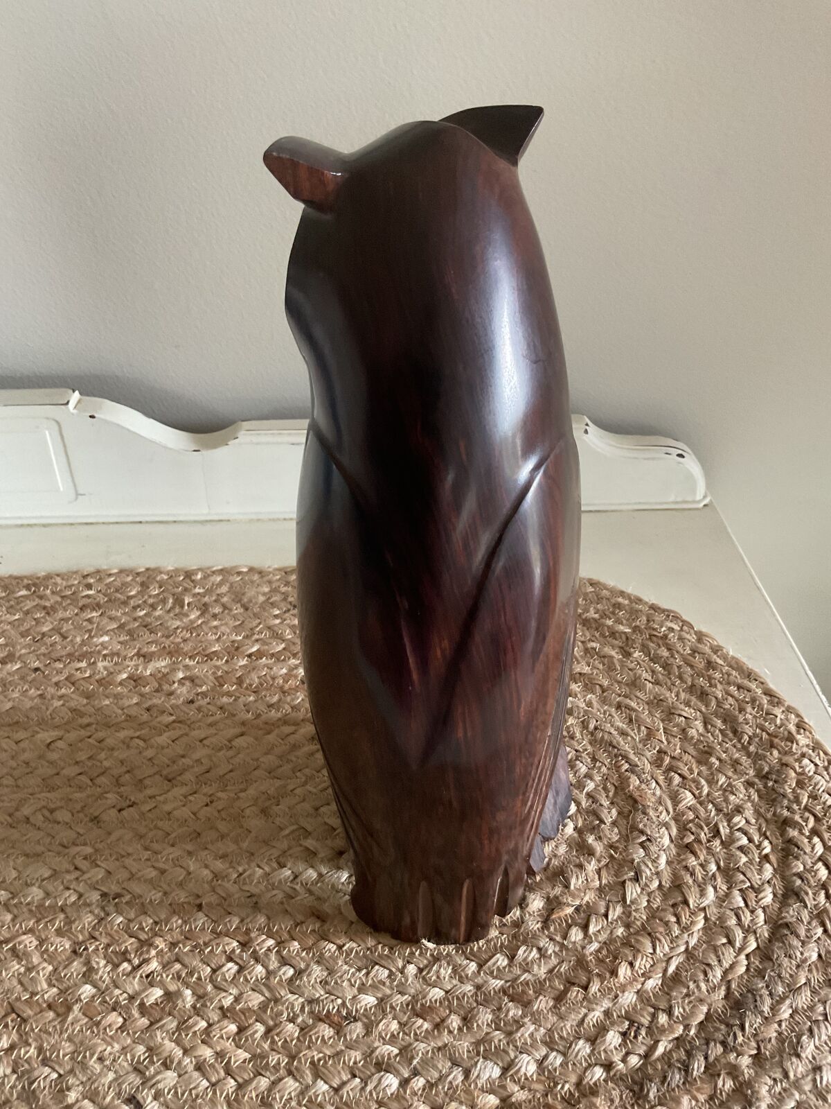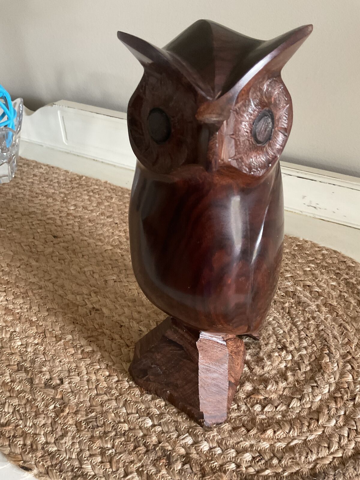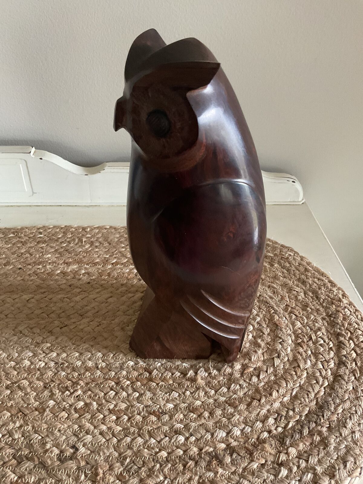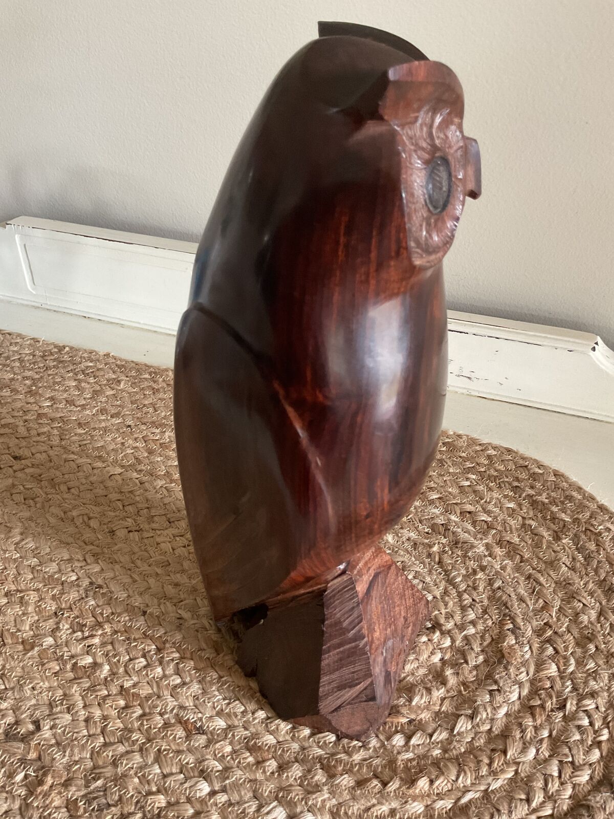 This owl is from a very dense and heavy ironwood. The L stands approximately 10 inches and sits on a wooden base that is about 5 inches.
