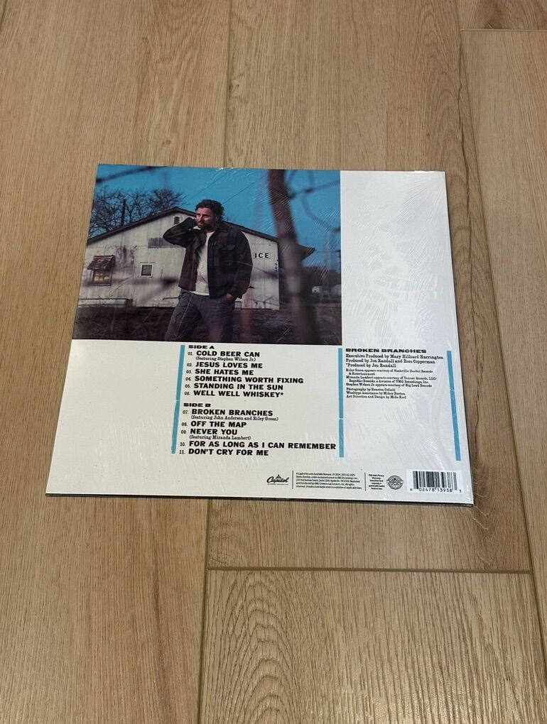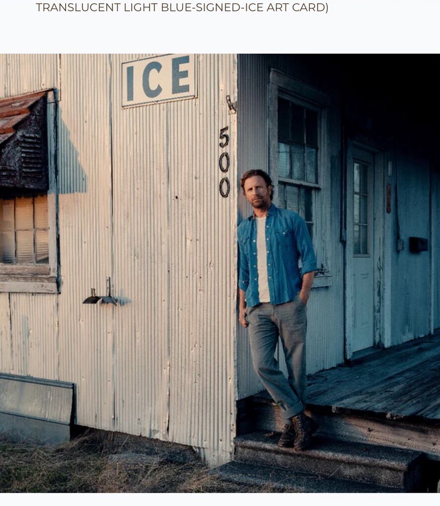 Dierks Bentley’s new album on translucent light blue vinyl with a signed art card, the “ice” signed art card. There were only a certain amount of these made and they sold out making them rare and great for any collection. This specific signed art card version and vinyl variant was very sought after and I think it was the most popular one and sold out first.