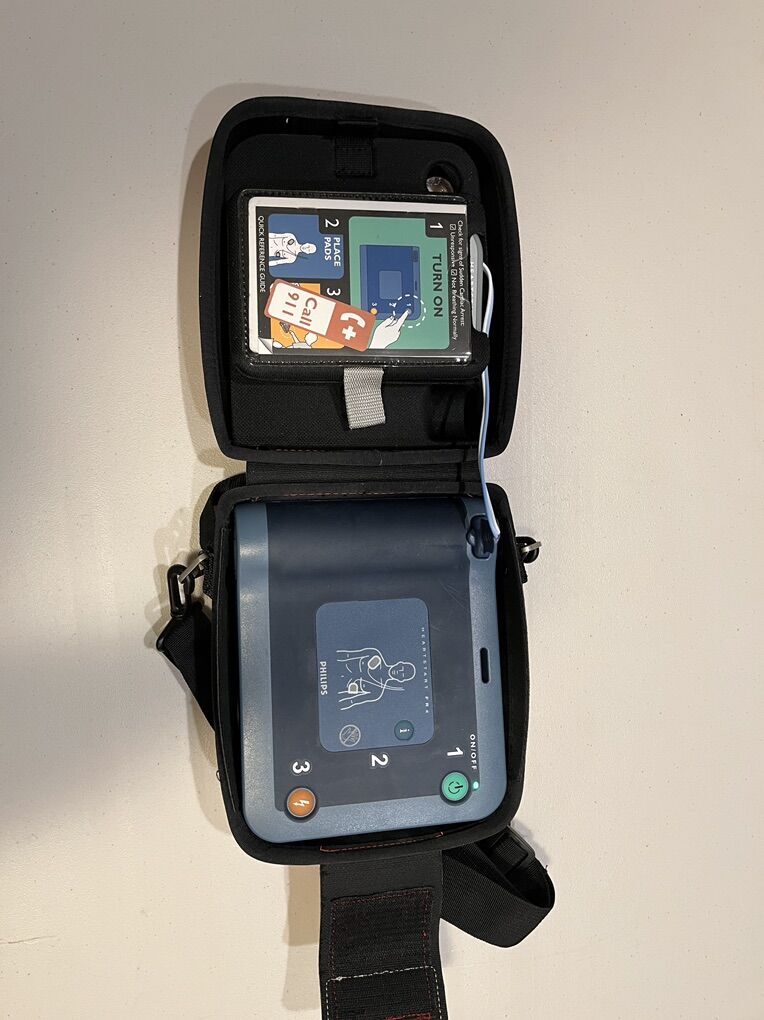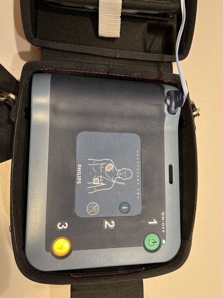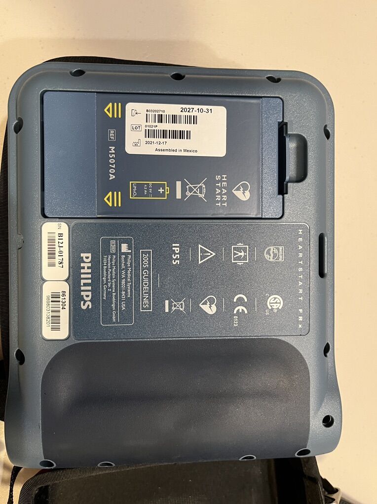 This is a FRx Phillips HeartStart defibrillator which is FDA approved. It comes with a new battery, some pads, and protective case.