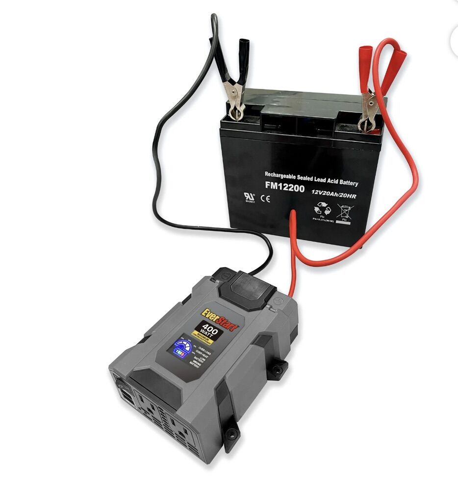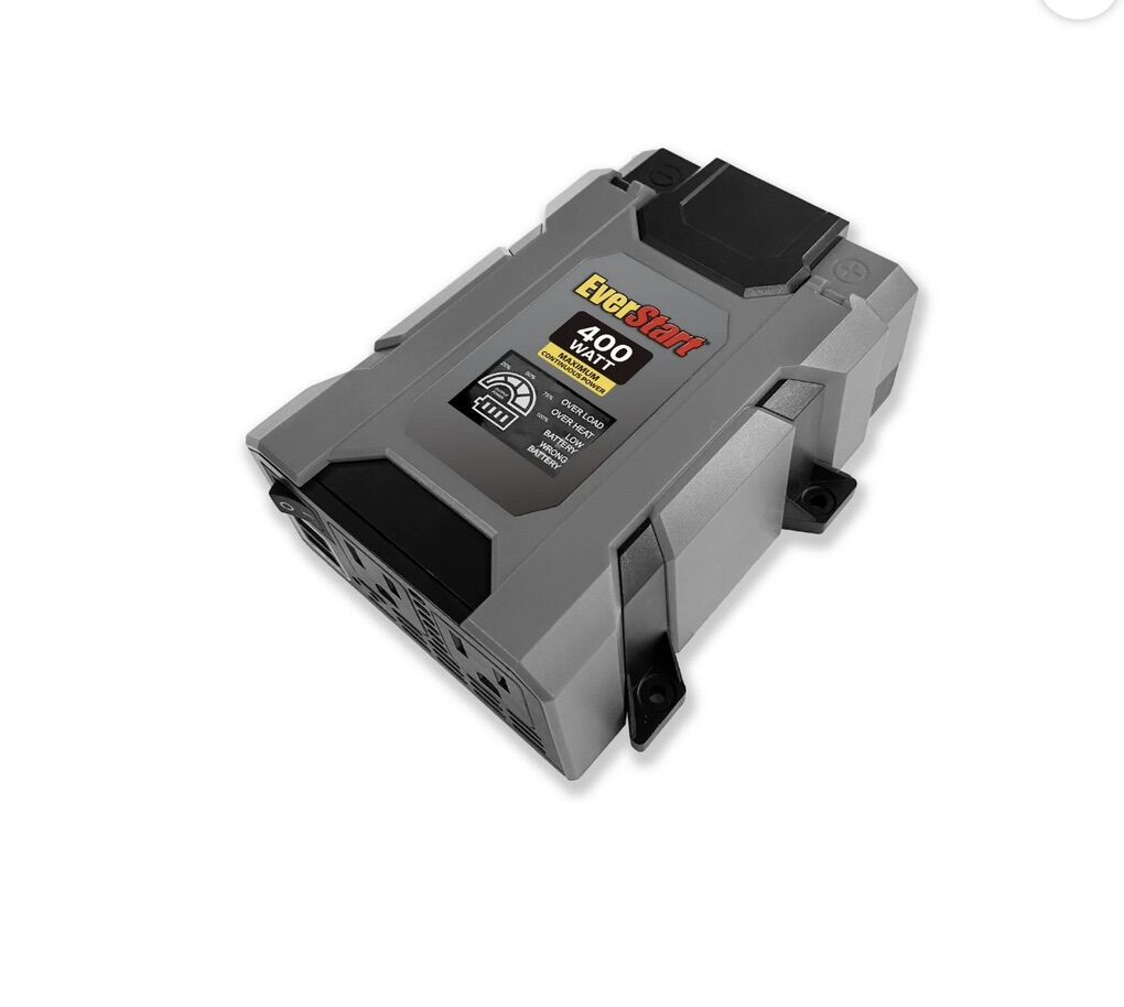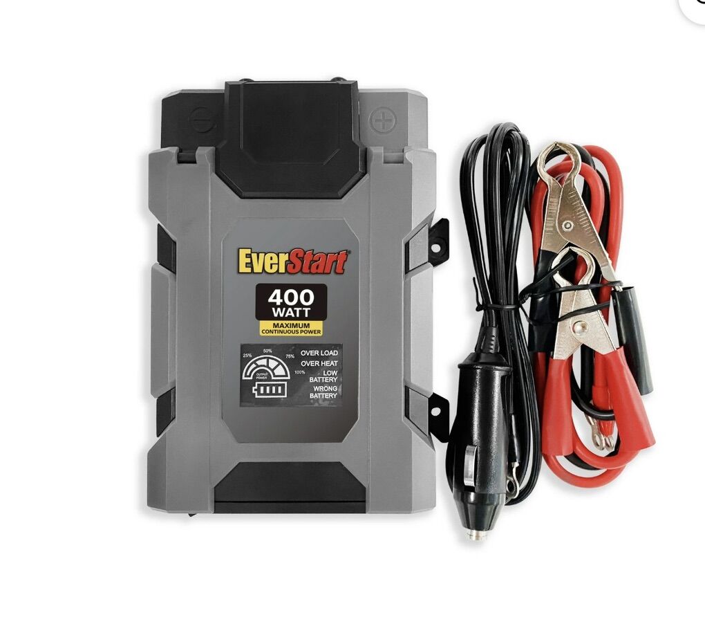 Compact Design: The Everstart 400 Watts Power Inverter features a compact design that can be easily stored in the glove box, under the seat, or in the trunk of your car when not in use. • Versatile Power: Converts 12V vehicle DC to 110V AC power, making it ideal for keeping electronic devices fully charged or powered on the road. • Dual USB Ports: Two universal USB ports with a total of 3.1 Amps allow for simultaneous recharging of Apple and Android- based mobile devices and accessories. • Dual AC Ports: Equipped with dual AC ports to power or charge electronics at 400 Watts using standard US plugs. • Digital Display: A digital display indicates when the inverter is actively providing power to your devices. • Safety Features: Includes protection against overloading, short-circuit, and overheating, ensuring safe operation. • Multiple Connections: Comes with an attached cigarette lighter plug and color-coded cables for two different ways to connect power. • Replaceable Fuses: Conveniently stored in the end cap, replaceable fuses provide added safety and ease of maintenance.