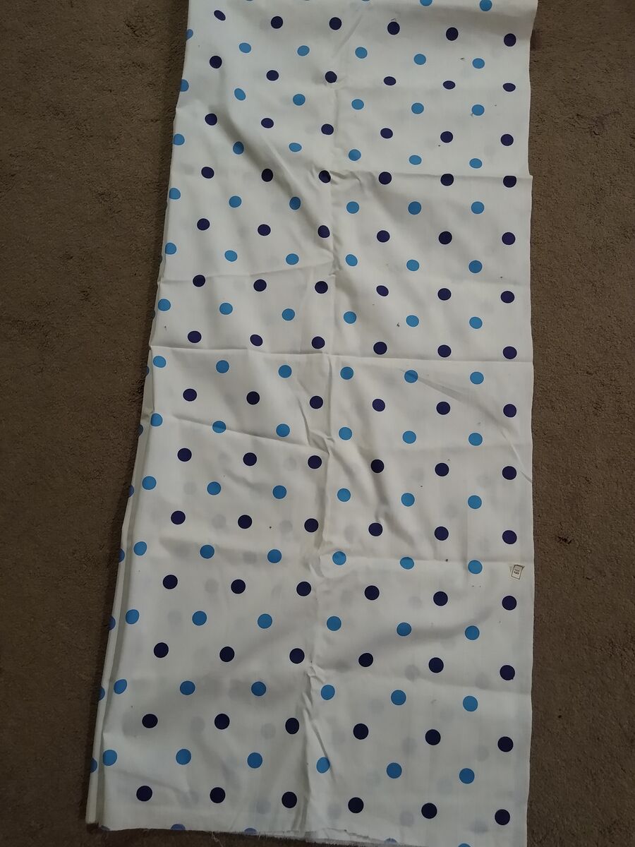 Vintage polka-dot polished cotton fabric. White background with navy blue and lighter blue dots. Approximately 2 1/3 yds x 36" W. Dates from the 1950’s or 1960’s. Smoke-free home. Cash only please.