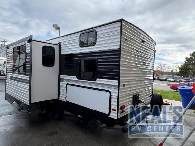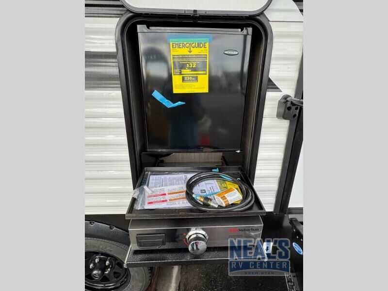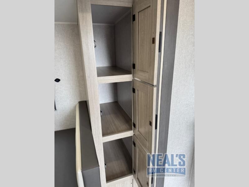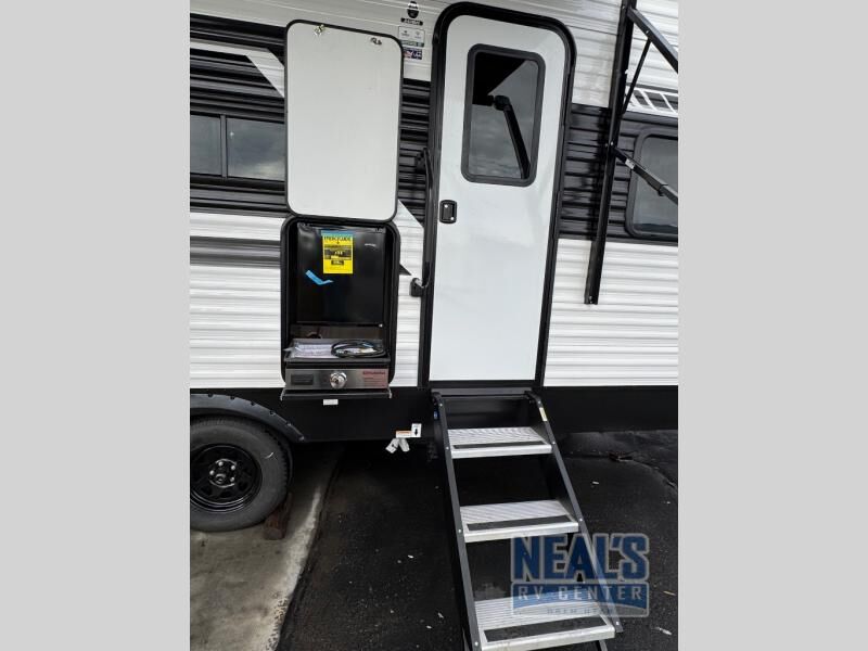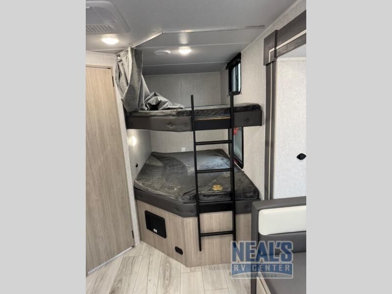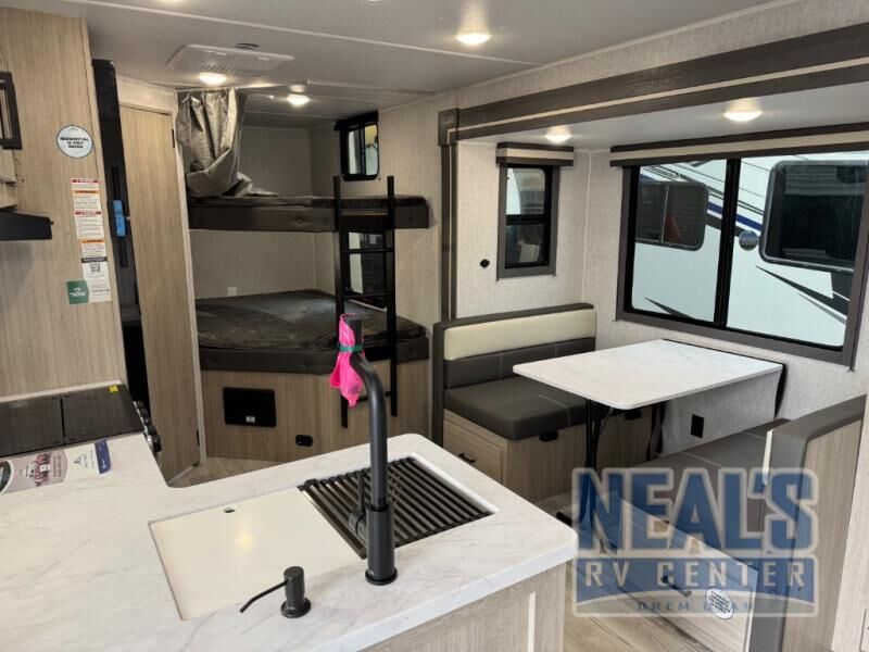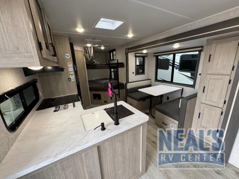 Head to the lake in this travel trailer with a large slide out for more space and comfort and additional sleeping space provided by the double-size bunks! Once you arrive, you can put out the 16' power awning, unload the pass-through storage, and make lunch on the outdoor kitchen with a pull-out griddle and refrigerator. The booth dinette inside can be used as dining space, and there is storage underneath here for added convenience. You will also find a full interior kitchen, and the full bath includes one of the dual entry doors for added convenience. When you're ready for some shut-eye, the king bed in the front private bedroom will feel just like home. There are also dual wardrobes and nightstands to keep your things tidy!