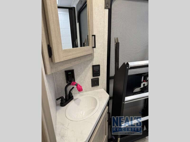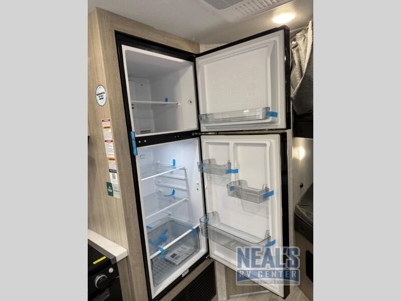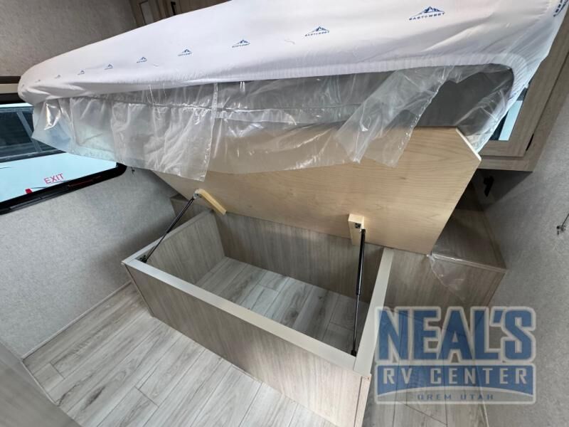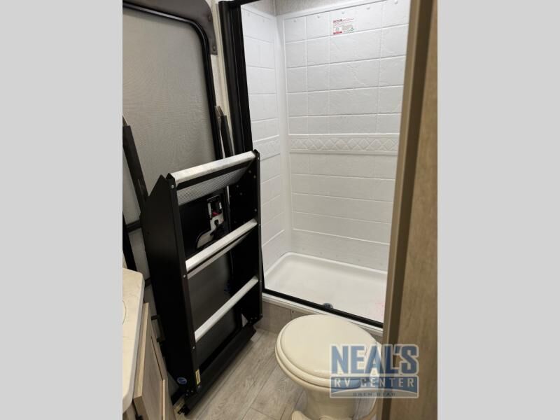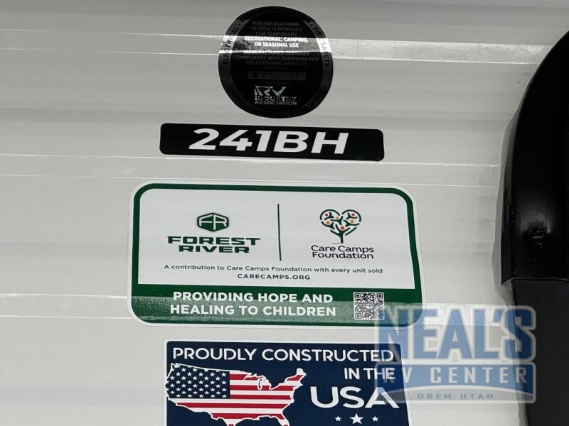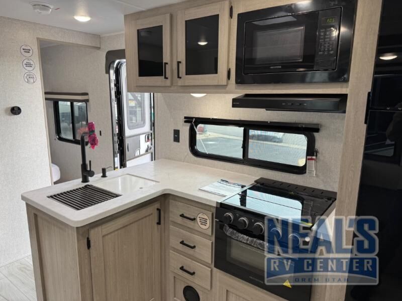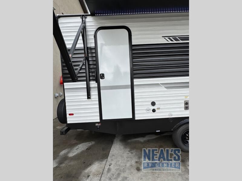 Head to the lake in this travel trailer with a large slide out for more space and comfort and additional sleeping space provided by the double-size bunks! Once you arrive, you can put out the 16' power awning, unload the pass-through storage, and make lunch on the outdoor kitchen with a pull-out griddle and refrigerator. The booth dinette inside can be used as dining space, and there is storage underneath here for added convenience. You will also find a full interior kitchen, and the full bath includes one of the dual entry doors for added convenience. When you're ready for some shut-eye, the king bed in the front private bedroom will feel just like home. There are also dual wardrobes and nightstands to keep your things tidy!