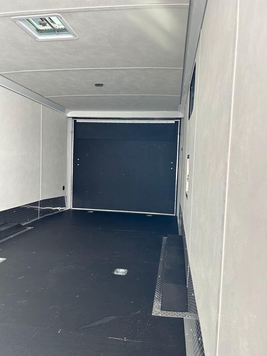 28' Sled Trailer Black Windows Poly Bead Flooring Lined Ceiling