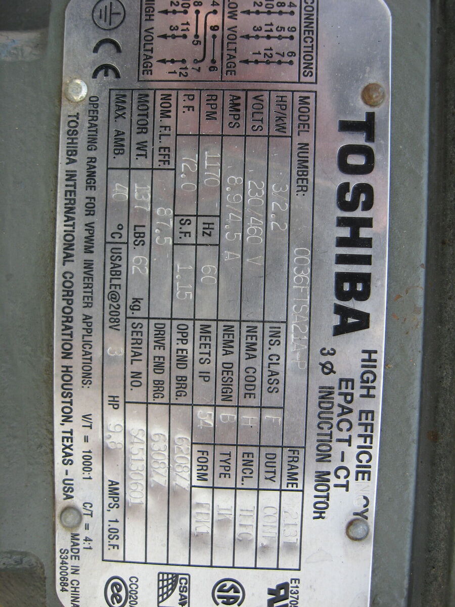 Nice used Toshiba 3 Hp Motor, 3 phase, 1170 RPM, totally enclosed fan cooled