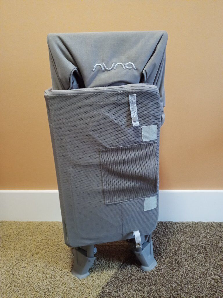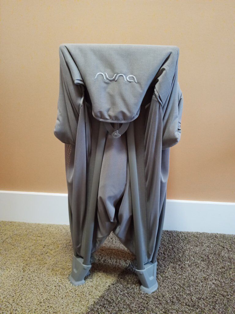 Nuna brand “Cove Aire Go” travel crib doubles as a playard and bassinet for baby’s growing needs.