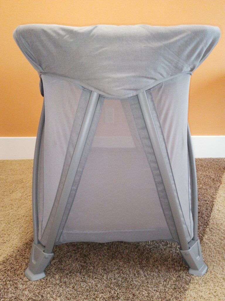 This very sturdy pack and play is easy to set up and take down in one movement, even with the bassinet attached. All joints are covered to avoid pinching.