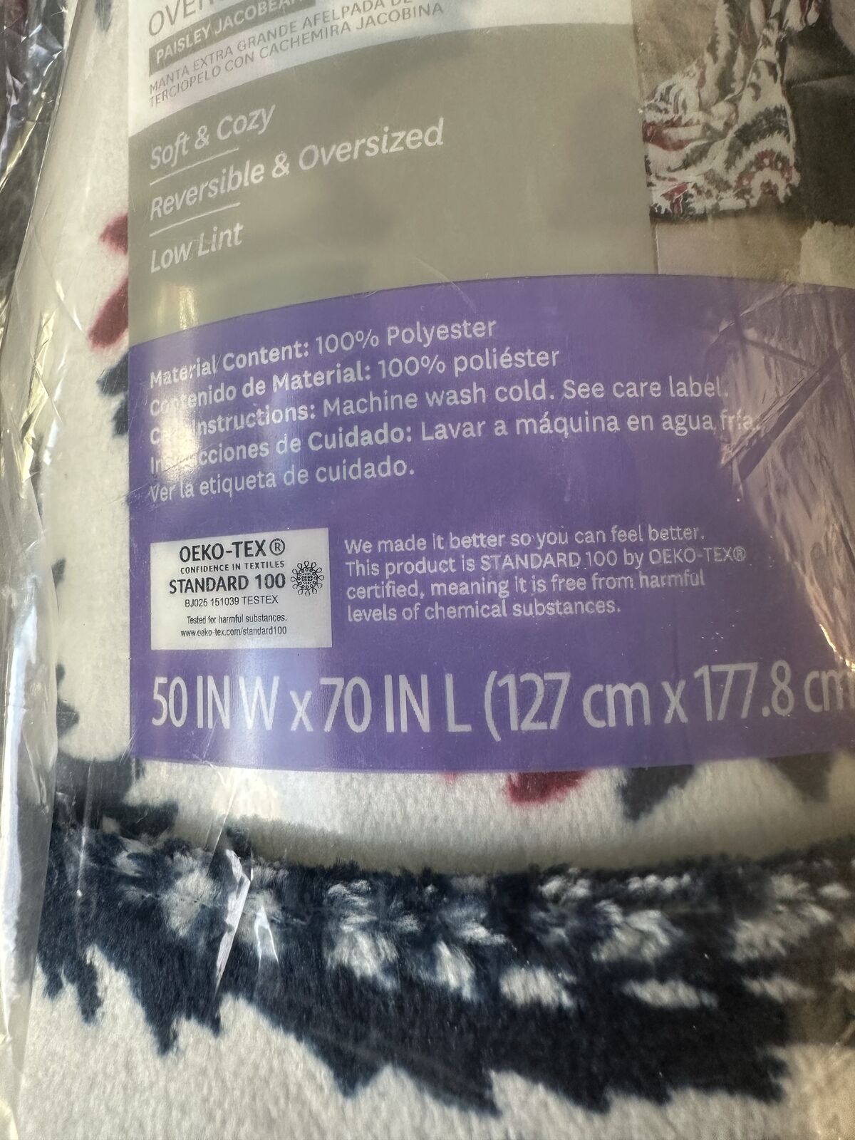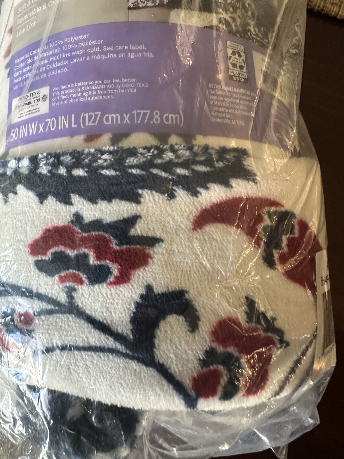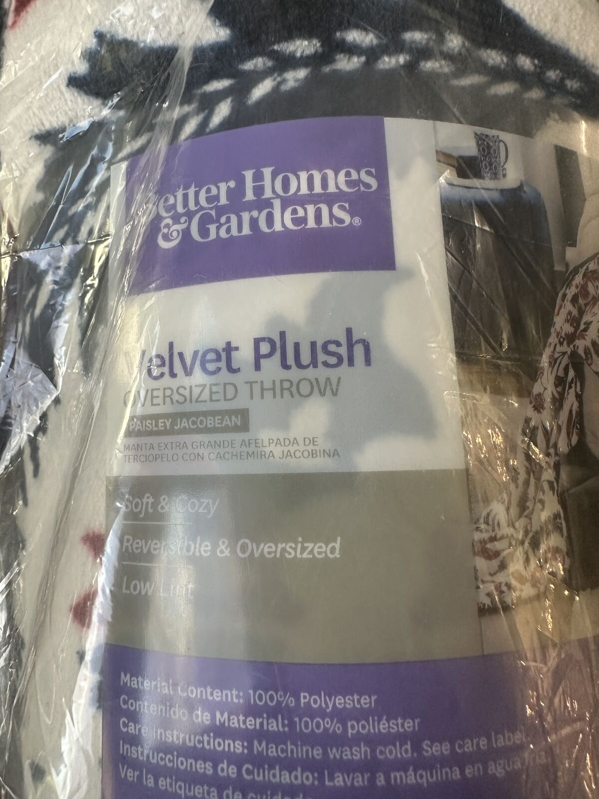 New Better Homes and Gardens Oversized Velvet Plush Floral Throw. Still in the unopened wrapper, it's white, maroon, and navy blue. 50" x 70". 100% polyester, machine washable, and low-lint. Reversible and Oversized, the pattern is called Paisley Jacobean.