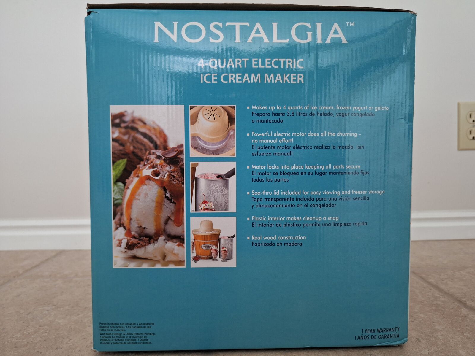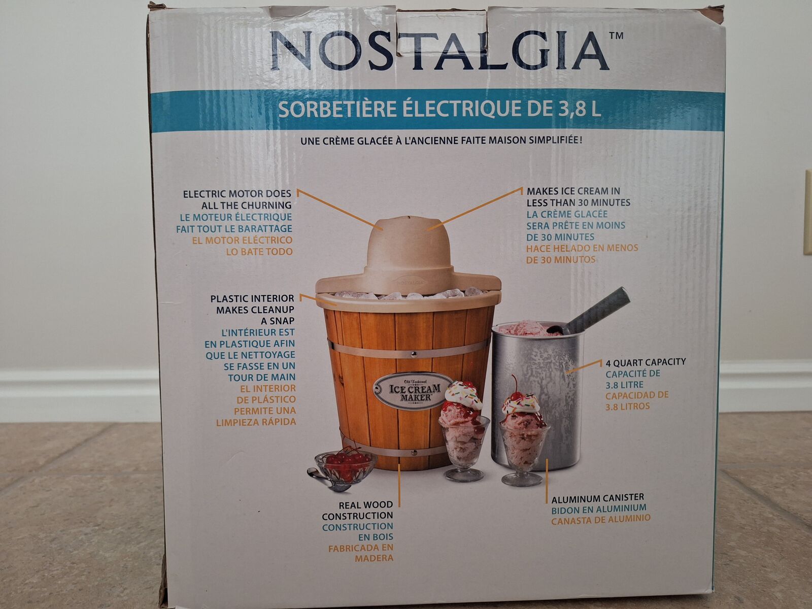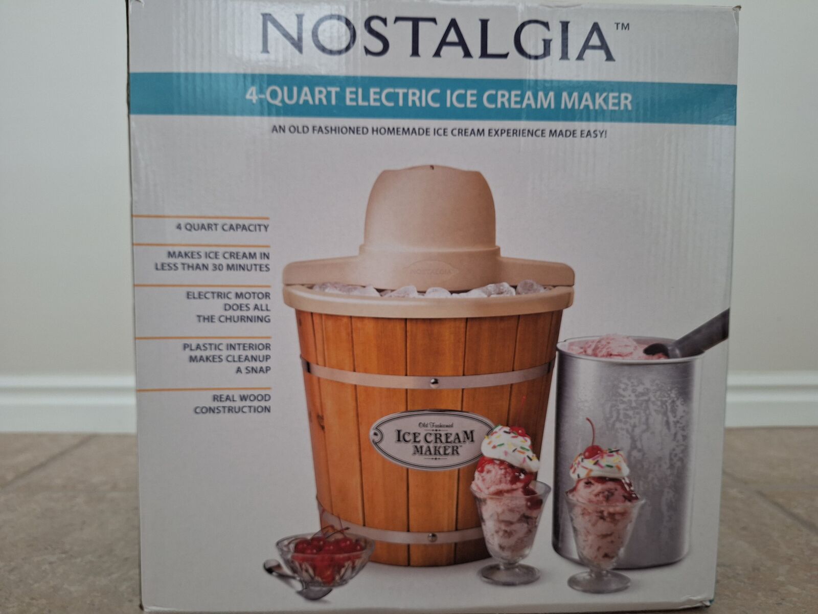 VenmoNew. Nostalgia 4 quart electric ice cream maker. Includes wood bucket. Never used and is in new original packaging.