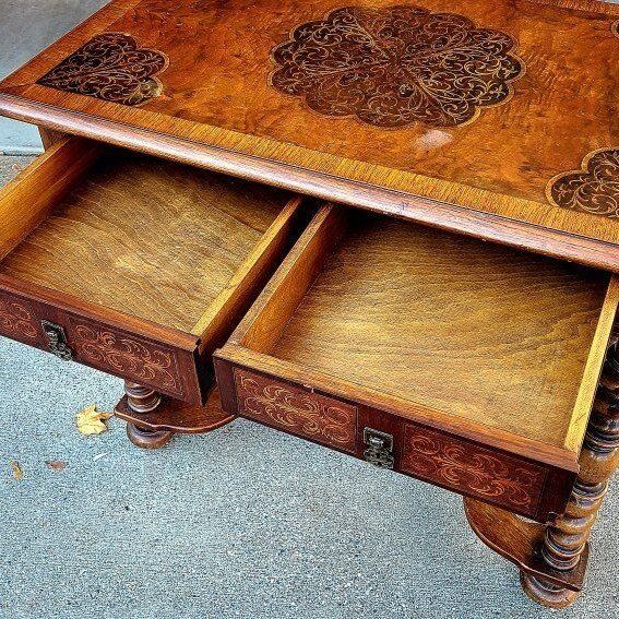 Beautiful William & Mary table. Exquisite inlay work on the top and drawers. Elegant drawer pulls. Solid high quality wood drawers.