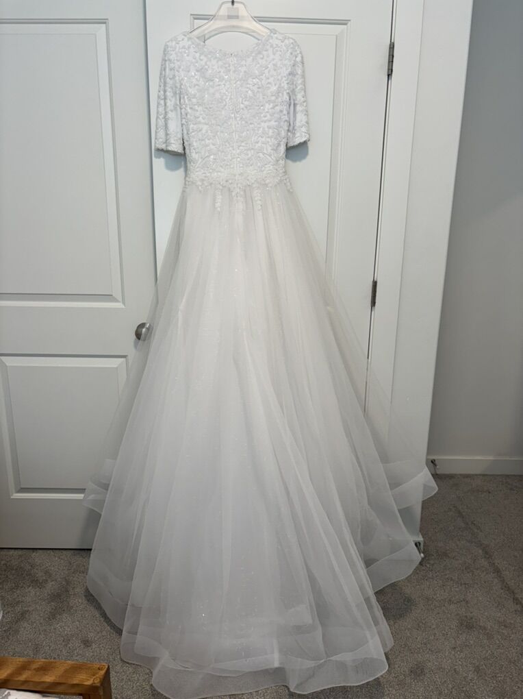 VenmoIf you live anywhere from Logan to Provo Utah, I will bring the dress to you! I bought this dress in 2023 for $1,300 and wore it on my wedding day. It is a size 6, I am 5'2 and 120lb. It has a beautifully hand beaded top and a sparkly skirt. I can include an underskirt (that can be worn underneath to make the skirt more full) and a veil if you want them. Let me know if you have questions or would like to look at it!