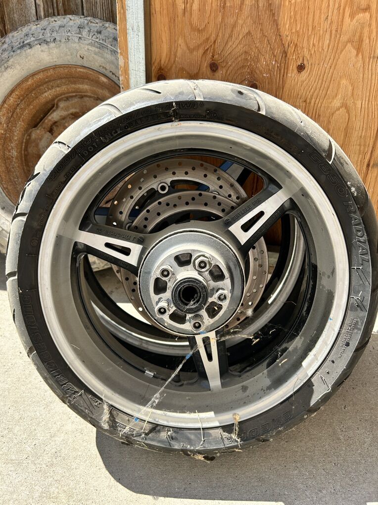 These are from a 2002 Yamaha Rd. star warrior. They have roughly 15,000 miles on them. Tires are shot, but rims are in good condition. Black and gray. They need cleaned up, but there is nothing wrong with them. Comes with rotors 17” rear and 18” front. Should fit all years of Warrior and possibly other motorcycles.