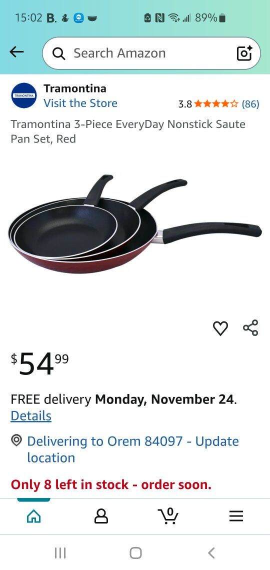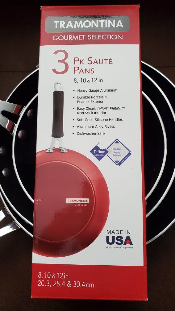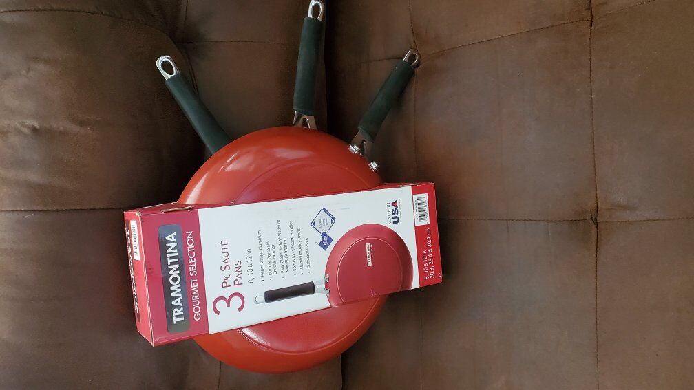 VenmoBRAND NEW in package, never used, never opened Tramontina 3-piece nonstick Sautee pans in red asking $40 (Amazon currently selling for $54.99 + tax)