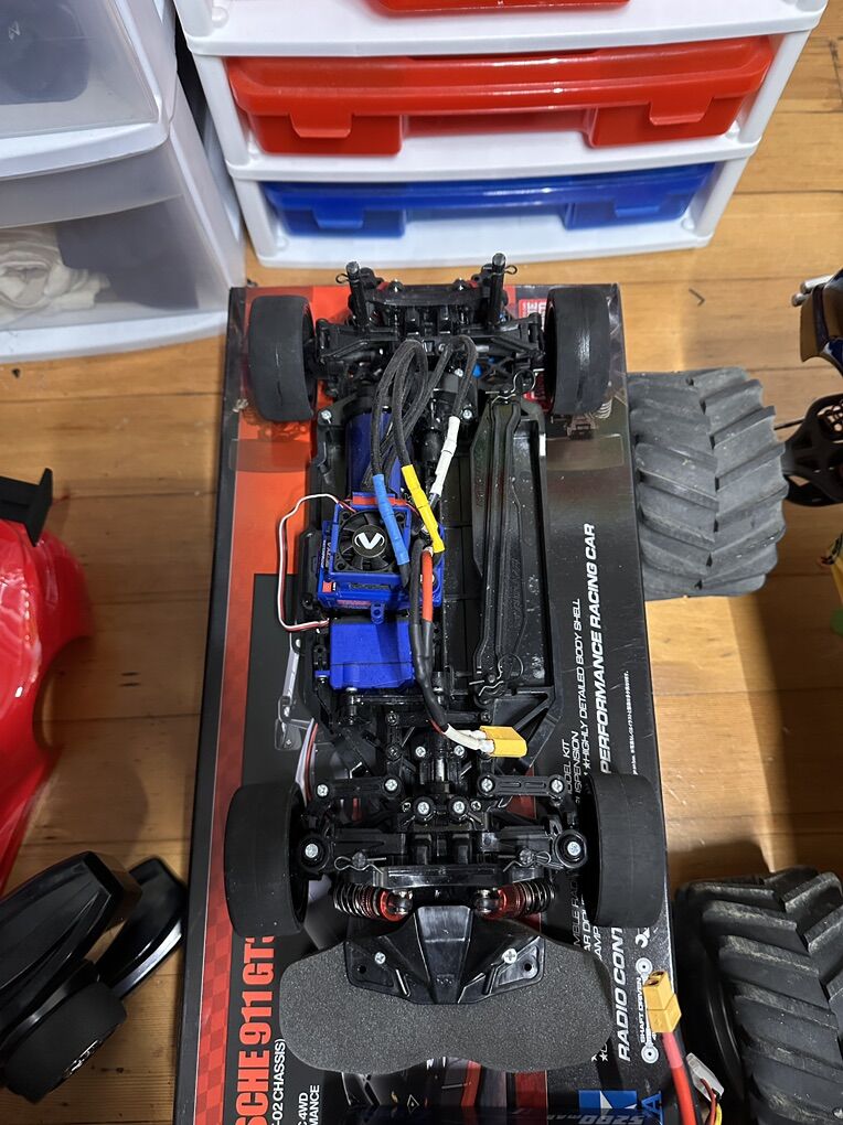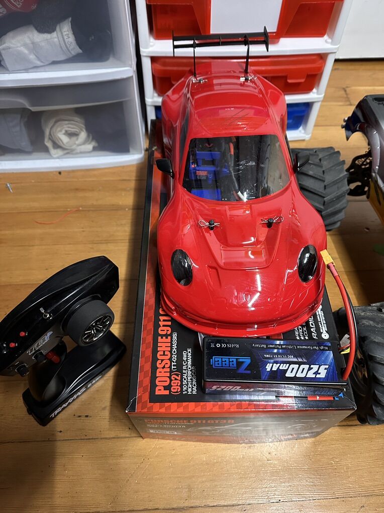 Tamiya TT-02 Porsche 911 GT3R -Traxxas brushless electronics so it’s way quicker. I somehow misplaced the rear wing, so I designed and 3D printed a better looking wing. I’ll throw in a few extra wings in case you break one;). -Comes with a 3s battery as well -Upgraded metal shocks front and rear -This one is newer that I haven’t even put the stickers on it yet. It does have a little road rash on the roof from when I tested it out but it’s not major