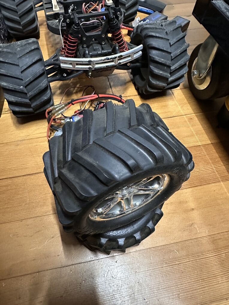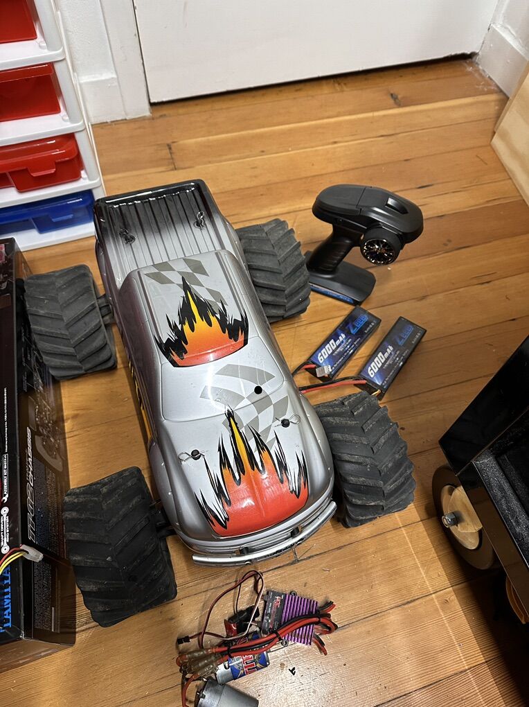 Traxxas E-Maxx -Mamba X system -(2) 2s 6000mah batteries -I 3D printed some battery hold downs since the original ones went missing and they work great! -Dumbo RC rx/tx -I also still have the OG electronics for it -2 spare wheels/tires