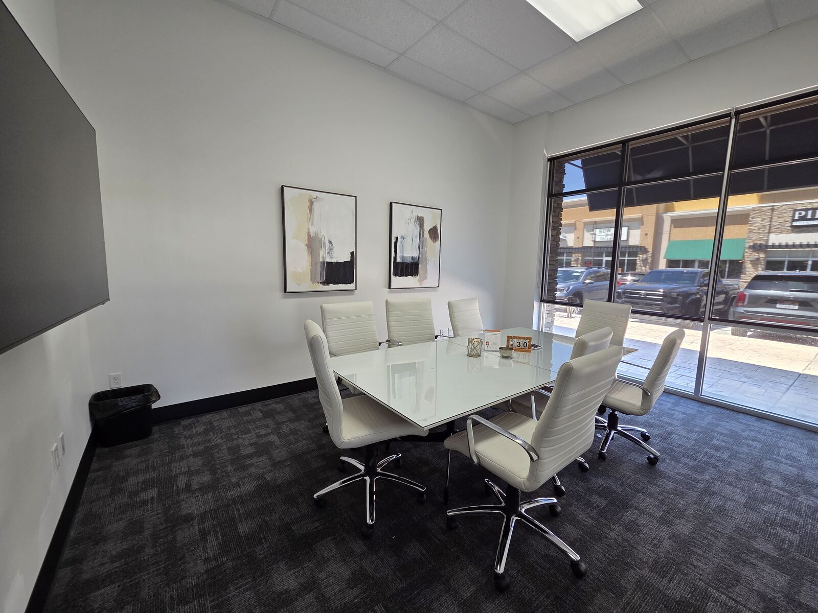 • End cap with large store front windows, 6 private offices, reception area, conference room, 2 restrooms, and full break room
