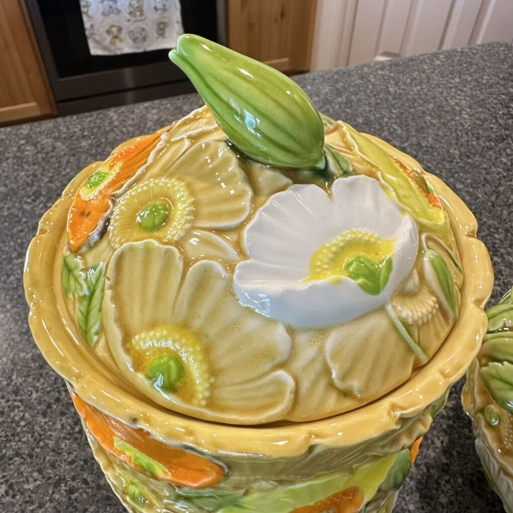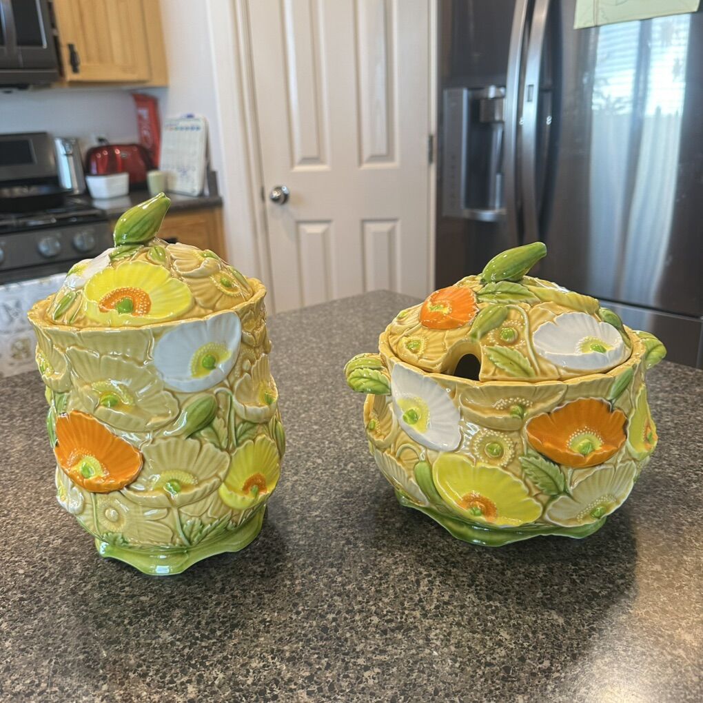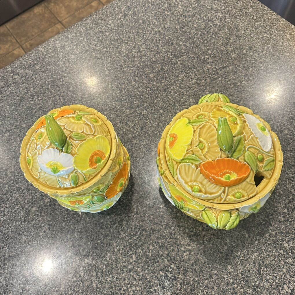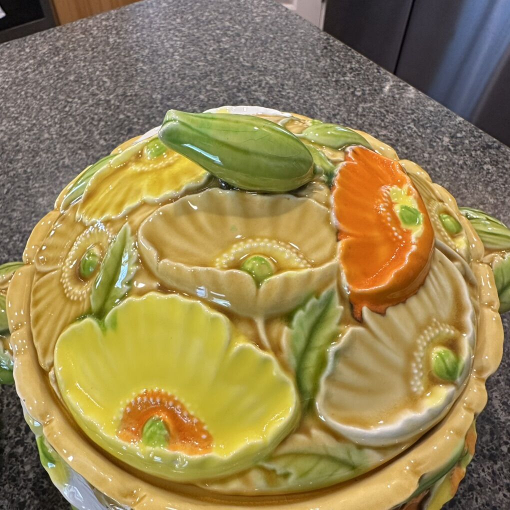 This is a beautiful set of Fred Roberts soup tureen without a ladle, a canister, and four bowls all with a tulip design. They are made of ceramic and they are all in excellent condition.