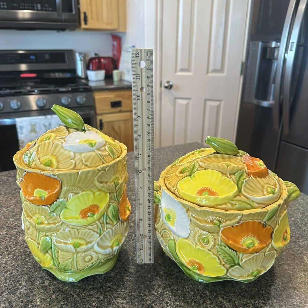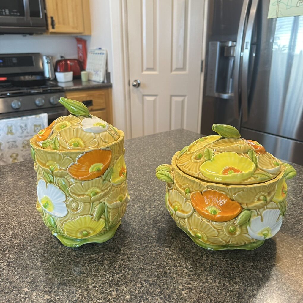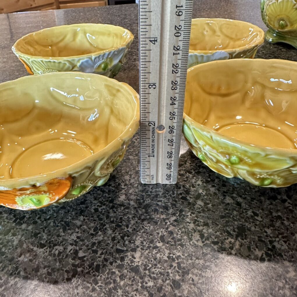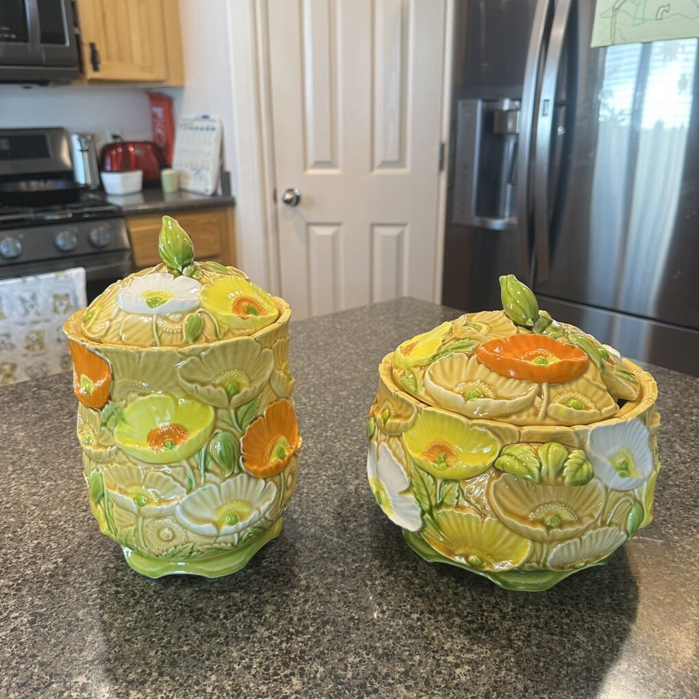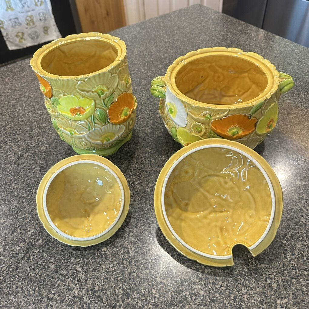 This is a beautiful set of Fred Roberts soup tureen without a ladle, a canister, and four bowls all with a tulip design. They are made of ceramic and they are all in excellent condition.