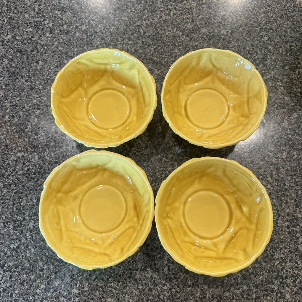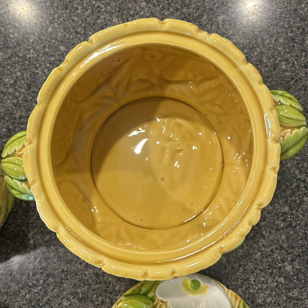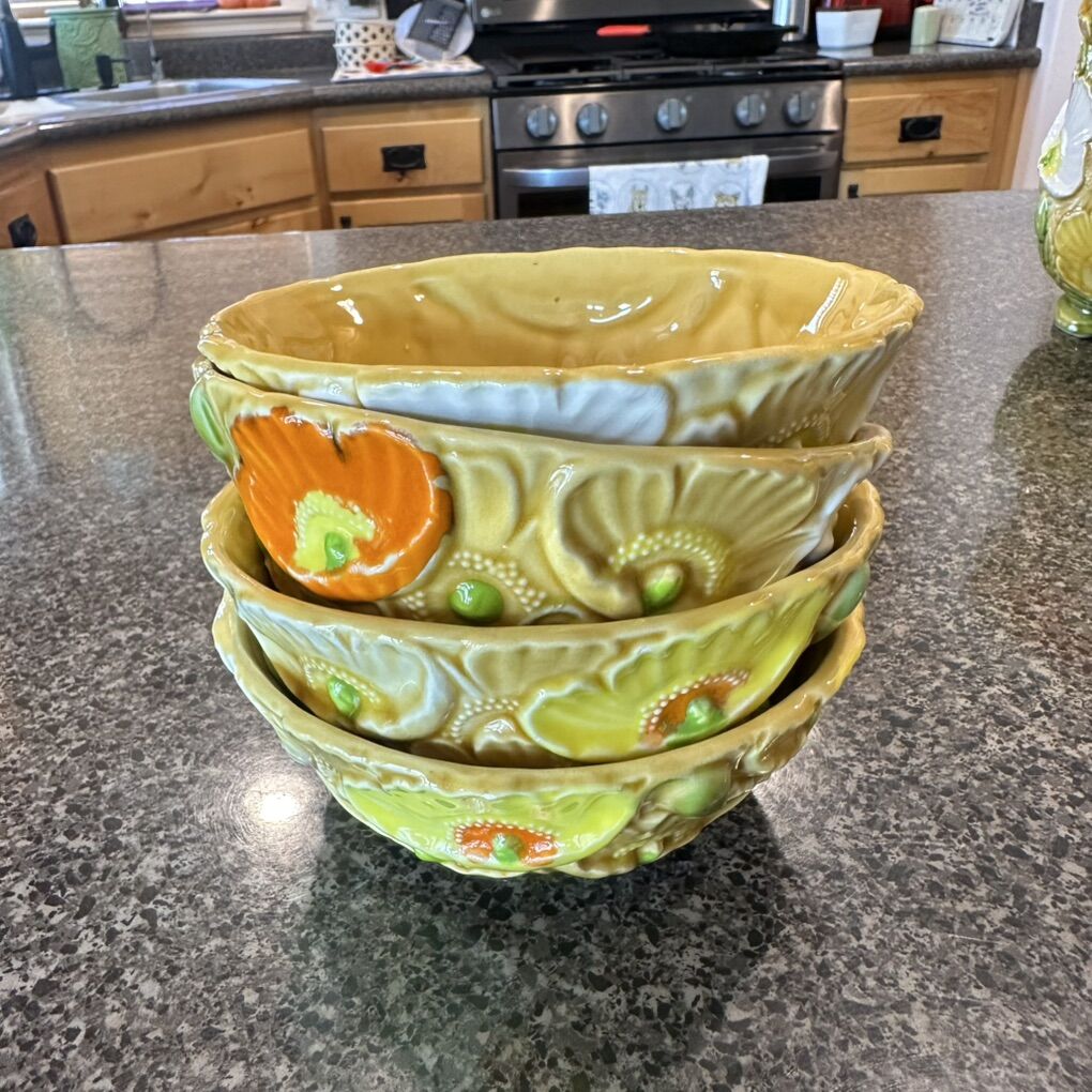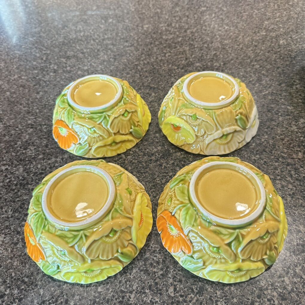This is a beautiful set of Fred Roberts soup tureen without a ladle, a canister, and four bowls all with a tulip design. They are made of ceramic and they are all in excellent condition.